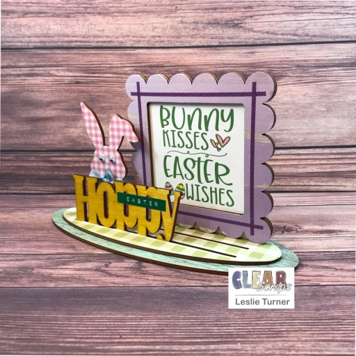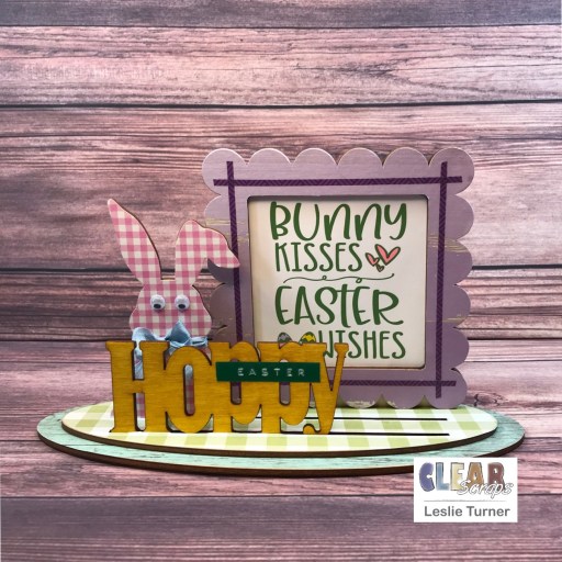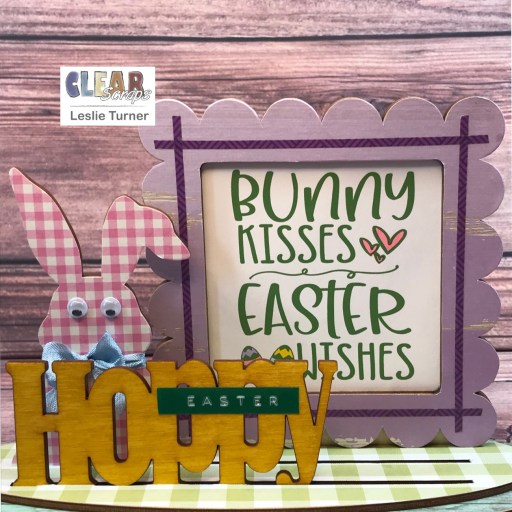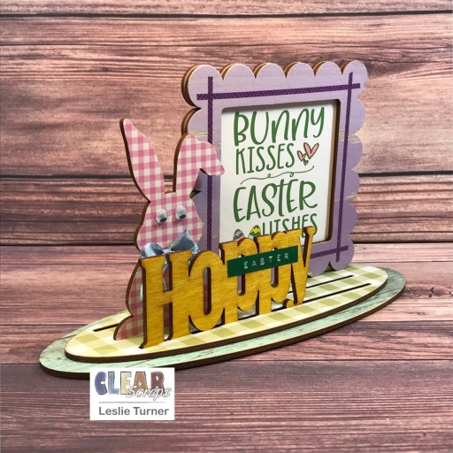 I started by covering the smaller base piece with green and white gingham paper and the larger base piece with green wood-look paper, and adhered them together. I then covered the scallop frame with ombre purple wood-look paper and added four long strips of purple skinny washi tape. I printed the large Easter sentiment on white cardstock, colored the hearts and eggs with alcohol markers, and adhered it between the layers of the frame. I covered the bunny with pink and white gingham paper and added mini wiggly eyes and a blue seam binding bow around her neck. I colored Hoppy with a yellow alcohol marker and added the Easter sentiment created with the Dymo labeler.
