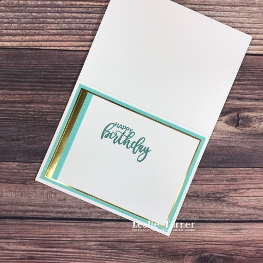 I cut the inside panel from Neenah Classic Crest 80# Solar White cardstock and embellished it with strips of the gold metallic foil cardstock and CutCardStock Pearl Canvas Textured Surf cardstock. I stamped the sentiment from the Waffle Flower Essential Sentiments stamp set in Catherine Pooler Skylight ink and layered the panel on gold metallic foil and then again on the surf cardstock.