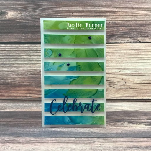 I created the smooshed panel using lemonade, citrus and sailboat blue alcohol inks, Ranger alcohol blending solution and Ranger Yupo paper a couple days before I created the card. I like to wait at least 24 hours before playing with an alcohol ink panel just to be sure it’s good and dry. I cut a 3-1/2″ x 6″ mini slimline card base from Neenah Classic Crest 110# Solar White cardstock along with an acetate panel cut from Grafix Craft Plastic. I trimmed the smooshed panel into strips, adhered them to the acetate with Retractable Tape Runner, and trimmed the panel to be slightly smaller than the card base. I applied Darice double-sided adhesive foam strips to the back of the panel and adhered it to the card base. I die cut the sentiment from CutCardStock Basis Blue cardstock and adhered it to the next to the last strip with Bearly Art precision craft glue. I added several YNS navy blue Glitter Gumdrops to complete the front.