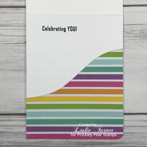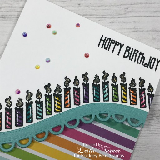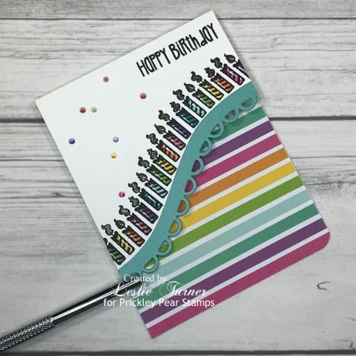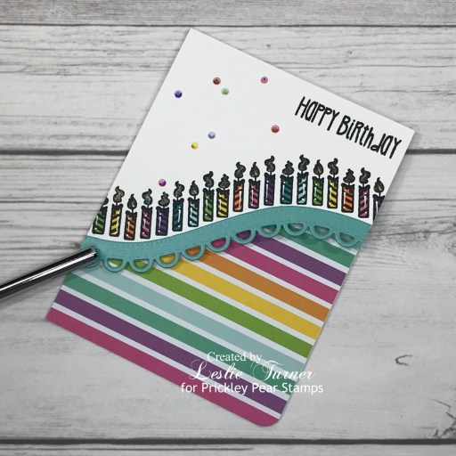 Hey everybody! Happy Tuesday – I hope your week is going well! Now that Spring is here, we are getting snowed on one last time! It started raining several hours ago which turned into snow. I need to get cat food and pick up a prescription today so I hope it doesn’t last long. Affiliate links are used in this post at no cost to you – I really appreciate your support! I’ve popped in to share a cute bi-level birthday card I created for Prickley Pear Stamps. I had the best time playing with the Flourish Border stamp set and coordinating Stitched Scallop Border die set. And you know me and pretty colors… I just couldn’t resist coloring these candles to coordinate with the striped patterned paper!