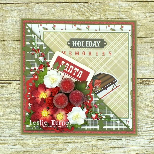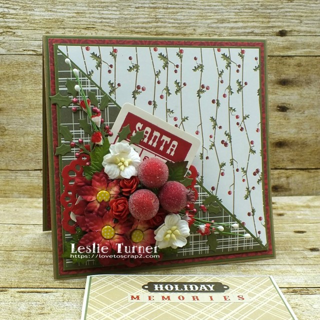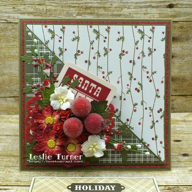 The pocket features a die cut doily embellished with a Santa Bingo card, die cut holly sprigs, and an assortment of flowers, berries and sprays.