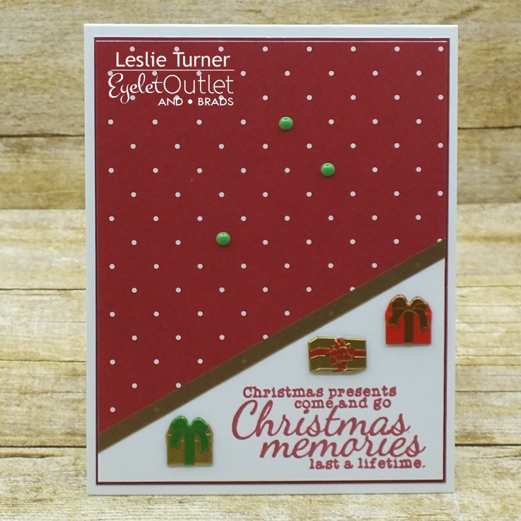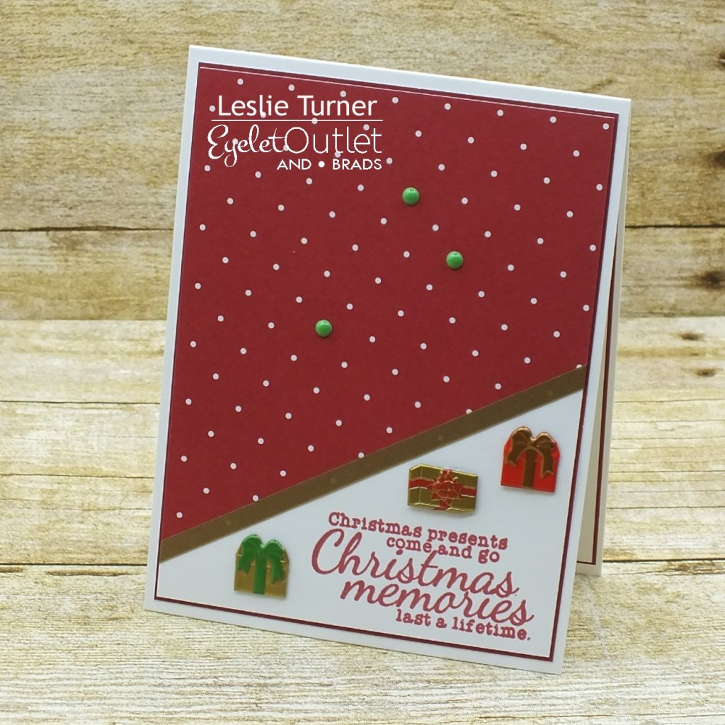 Hi everyone! A big ol’ Happy Saturday to you! I hope you’ve had an awesome week and are planning to do something fun and relaxing this weekend! Affiliate links are used in this post at no cost to you – I really appreciate your support! I’m stoked to be back on the Eyelet Outlet blog today with another awesome DT inspiration project! I created a card using some of the new brads that hit the store a few days ago! What’s more fun than new brads?! These Gift Brads are super versatile and can be used for any occasion, and I paired them with our Gold Skinny Washi Tape and Green Enamel Dots to create a simple Christmas card!