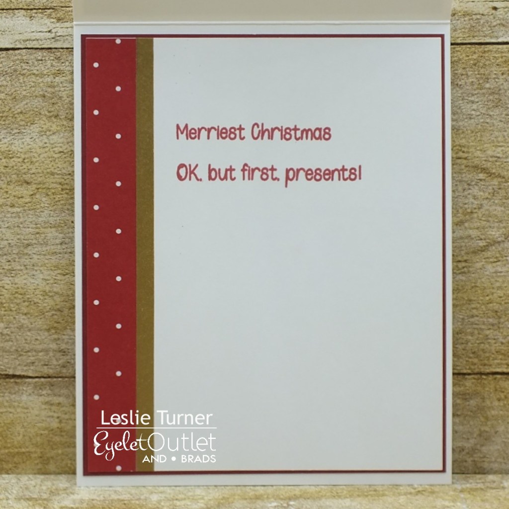 I cut a standard size A2 top-folding card base from Neenah Classic Crest 110# Solar White cardstock, along with layering panels from Neenah Classic Crest 80# Solar White cardstock, CutCardStock Basis Dark Red cardstock and Christmas Holiday Print 6×6 Cardstock Pad. I cut the white cardstock and red dotted cardstock layering panels at an angle, butted them together and applied a strip of Gold Skinny Washi Tape at the seam. I stamped the sentiment in red ink, added the Gift Brads, and adhered the panel to the dark red cardstock. The finishing touch on the front was the addition of several Green Enamel Dots.
