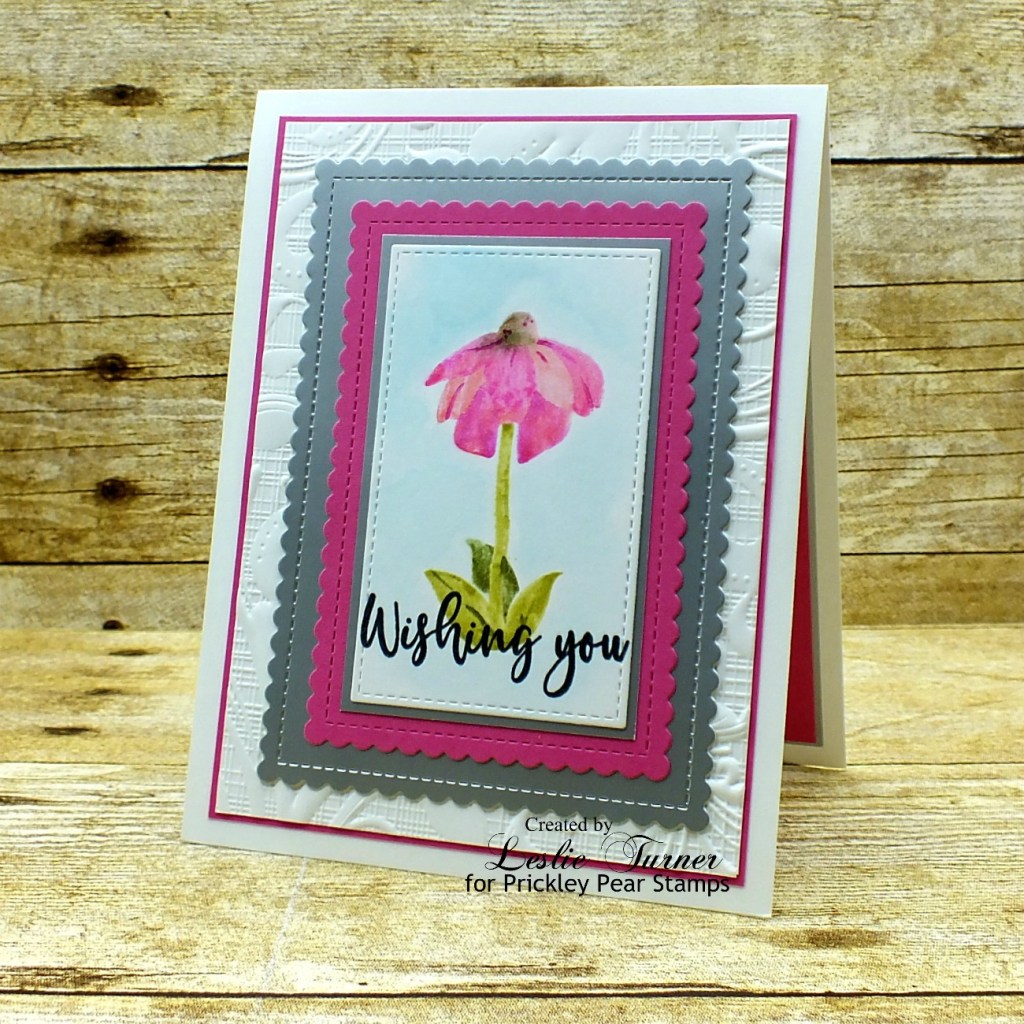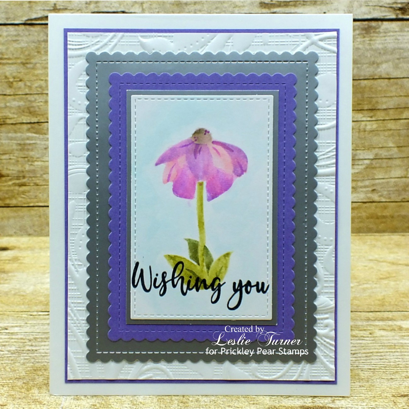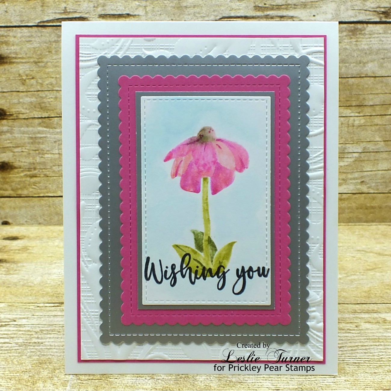 Hi everyone! I hope you’re doing well and staying safe! The hubby and I are continuing to do the #alonetogether thing which, at this point, looks like the new norm. Definitely better safe than sorry! I’ve popped in to share a few more samples I created for Prickley Pear Stamps! I’m having an absolute blast playing with these amazing stamps and dies! I created a set of three watercolor ‘Wishing you…’ cards created with the beautiful Build a Flower – Flower Hug For You Coneflower clear stamp set.