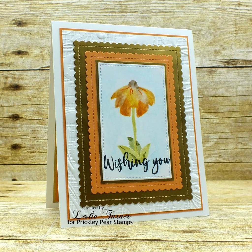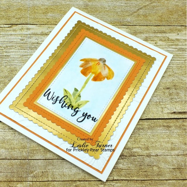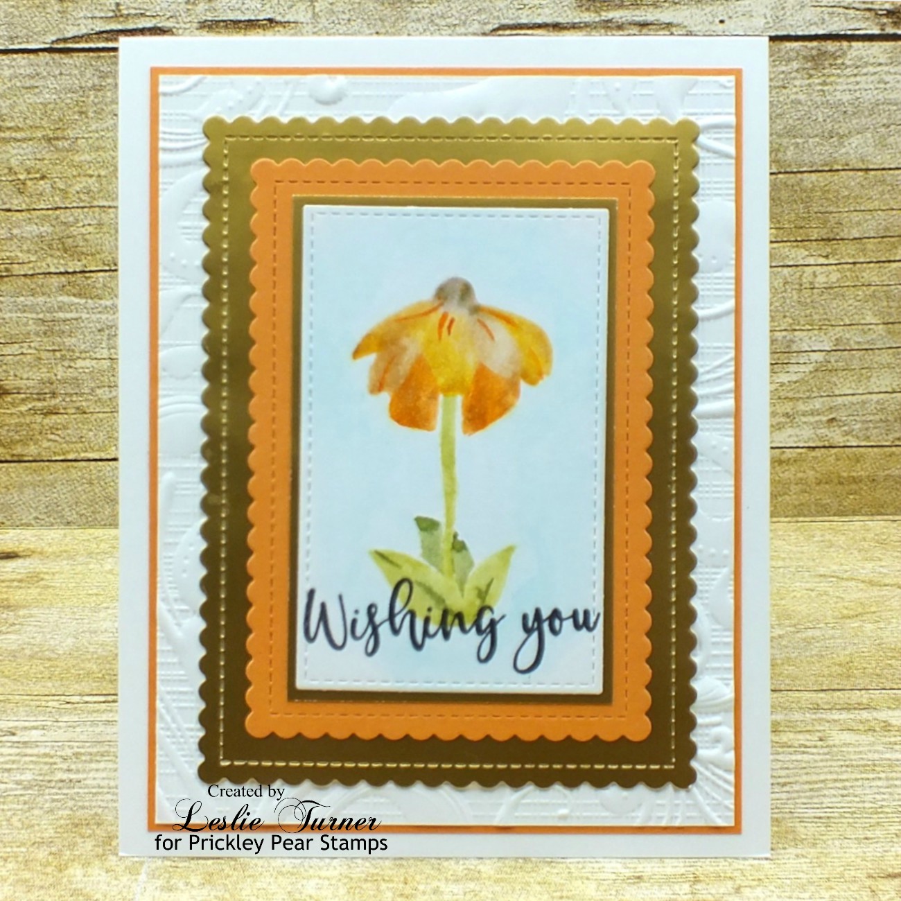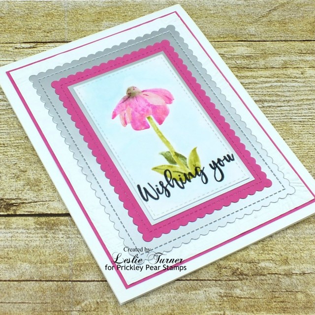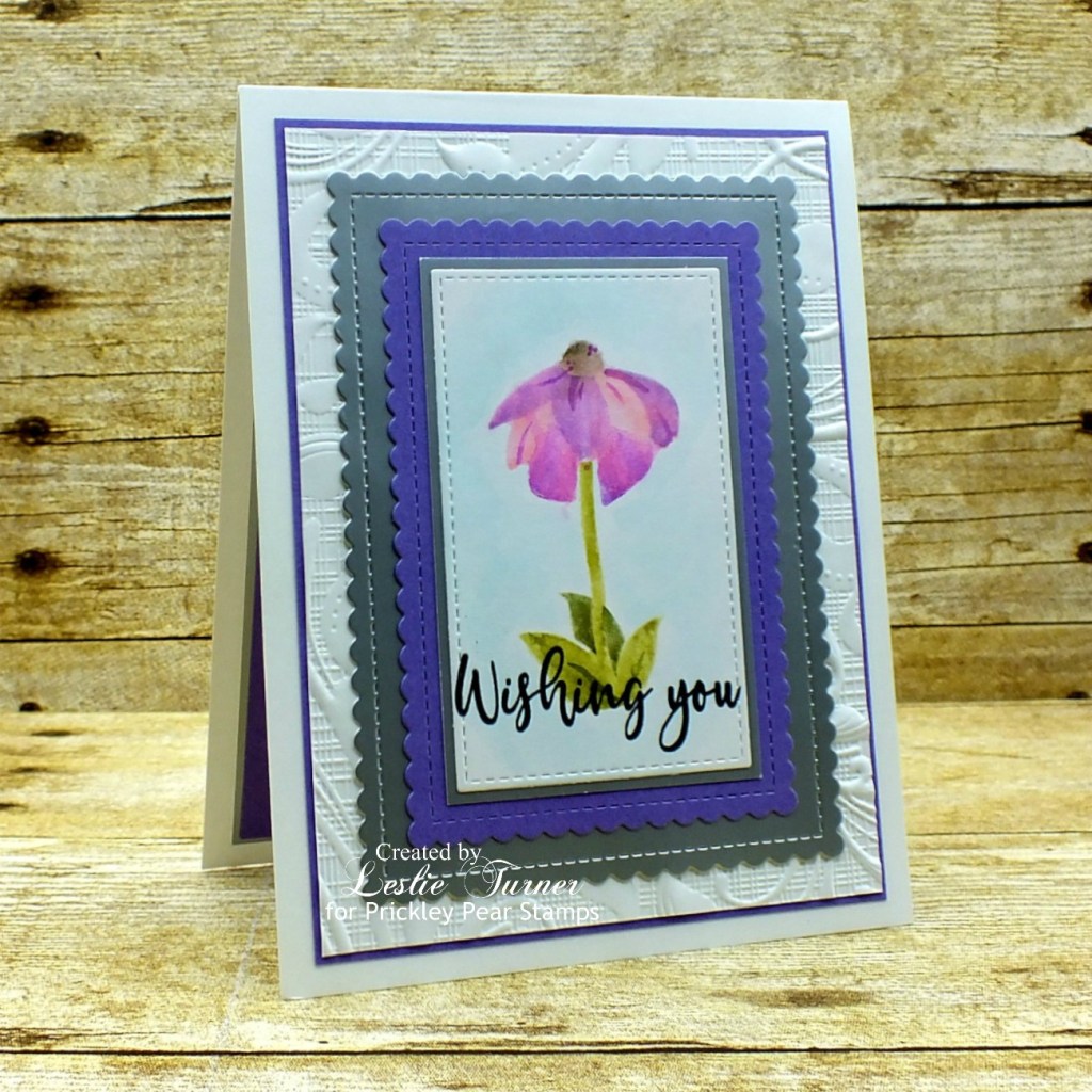 Hi everyone! I hope you’re doing well and staying safe! The hubby and I are continuing to do the #alonetogether thing which, at this point, looks like the new norm. Definitely better safe than sorry! I’ve popped in to share a few more samples I created for Prickley Pear Stamps! I’m having an absolute blast playing with these amazing stamps and dies! I created a set of three watercolor ‘Wishing you…’ cards created with the beautiful Build a Flower – Flower Hug For You Coneflower clear stamp set.