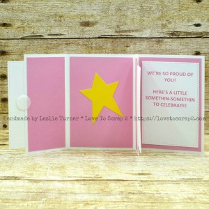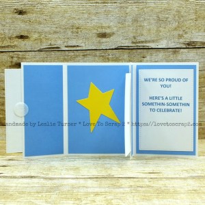 I’ve had handwritten instructions for this gift card holder in my tutorial folder for many years (credit goes to Gina K Designs and StampTV) and have made quite a few of them for various occasions. If you’re interested, the cutting and scoring details are outlined in a fairly recent post on my blog HERE. I colored the images with Nuvo alcohol markers and cut them with a stitched rectangle die. The inside sentiment panels were cut with the same stitched rectangle die. The sentiments are computer-generated. The closure (hidden beneath the focal image on the front) is a velcro circle. To tie in the stars in the image on the front, I added a primitive star die cut to the left side of each. Here is the male version…