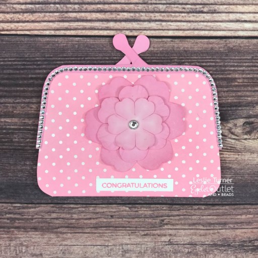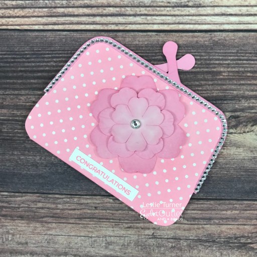 I cut the base from a dotted ink-resist paper and inked it with Ranger spun sugar distress ink and then with Catherine Pooler It’s A Girl ink to darken it up just a bit. I cut the coin purse frames with clasps from CutCardStock Pop-Tone Cotton Candy cardstock and adhered them to the base. I adhered a Light Pink Paper Flower with a Silver Edge Clear Jewel Brad to the center front, and then added Clear Jewel Bling Strip around the front edge of the coin purse frame. I stamped a sentiment from the Trinity Stamps A Sentiment For (Almost) Everything stamp set in pink ink, trimmed it and adhered it beneath the flower.