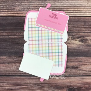 I cut the inside pockets from a plaid patterned paper and punched half-circles in the tops before adhering them. I created a card to slip into one of the pockets cut from CutCardStock Pop-Tone Cotton Candy cardstock and Neenah Classic Crest 110# Solar White cardstock. I rounded the corners, stamped a sentiment in pink inks using the Hero Arts Year Round Messages stamp set and Trinity Stamps A Sentiment For (Almost) Everything stamp set, and adhered the panels together. The white card at the bottom of the photo on the right represents a gift card. This is such a fun project and the coin purse can be made for literally any occasion in any color scheme!