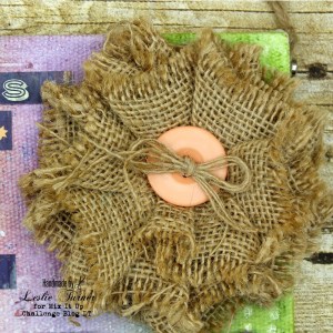 I stamped, colored and fussy cut a pen, bottle of ink, bottle of glue, painter’s palette and brush, and tube of paint, all from The Hedgehog Hollow. I stamped sentiments (also from The Hedgehog Hollow) in pink and green ink and die cut them – and discovered that those inks aren’t waterproof. I somehow got a droplet of water on the green sentiment and was about to re-stamp it when I thought ‘nope, that just adds to the mess’ so I left it alone. I added a twine hanger constructed of three lengths of twine that I knotted every couple inches and attached with a screw on each side of the canvas.