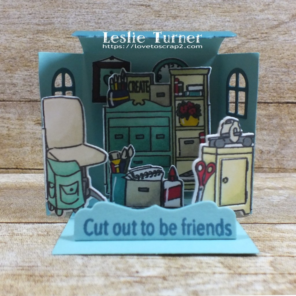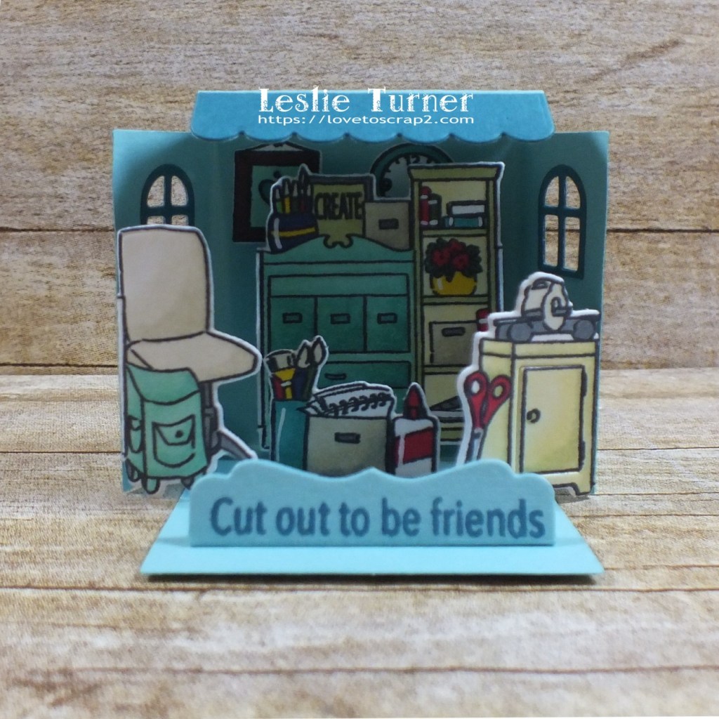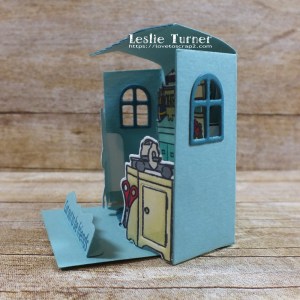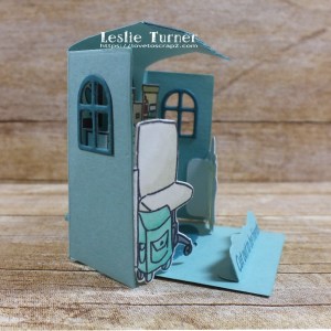 I cut the base from CutCardStock Basis Aqua cardstock and used CutCardStock Basis Teal cardstock for the window trim on both sides and the rug. I stamped all the elements on Neenah Classic Crest Solar White cardstock, colored them with alcohol markers and cut them with the coordinating dies.