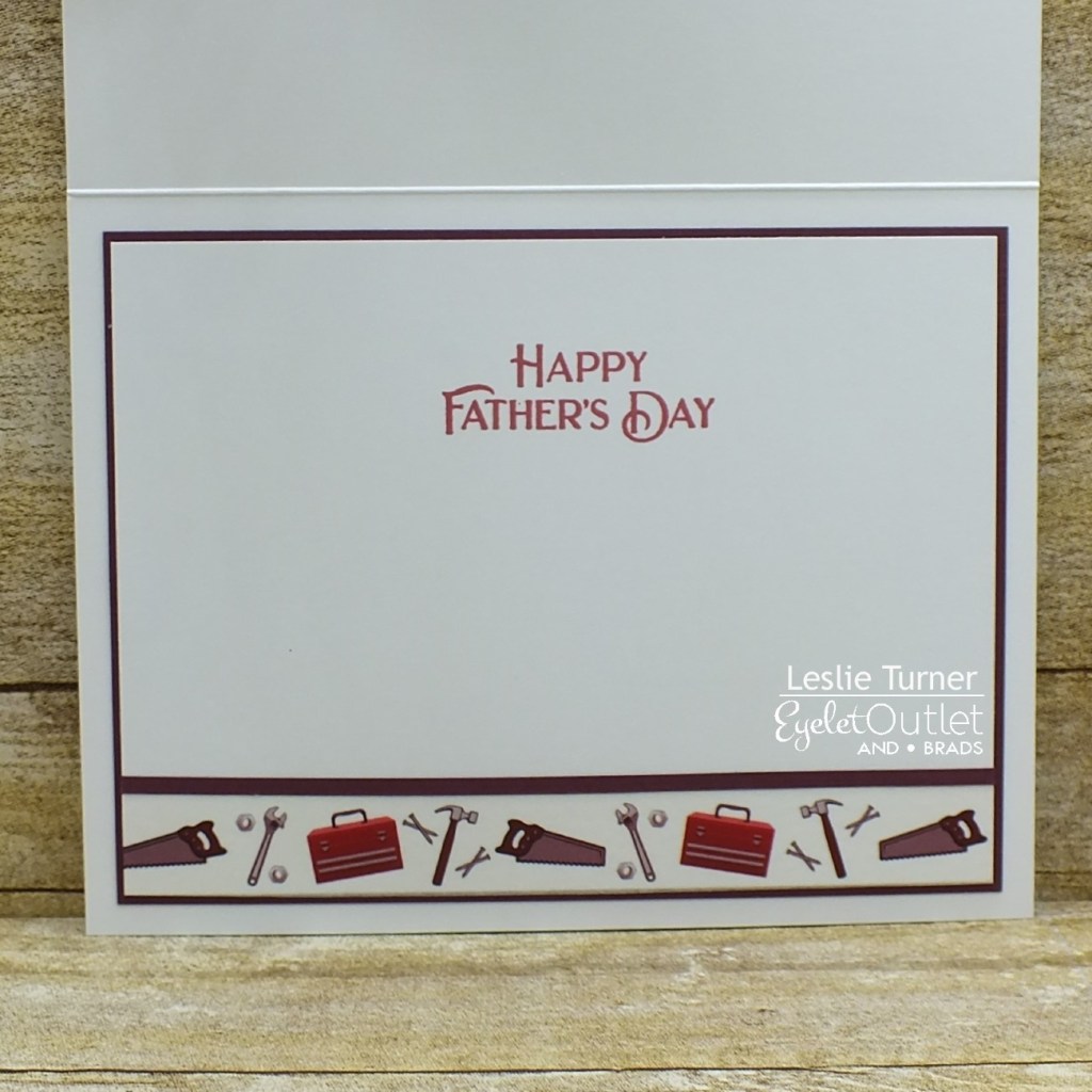 I cut a standard A2 size top-folding landscape card base from Neenah Classic Crest Solar White 110# cardstock. I then cut strips from Neenah Classic Crest Solar White 80# cardstock and CutCardStock Royal Sundance Linen Burgundy cardstock which I layered together and added a strip of Tool Washi Tape across the bottom. I adhered a very thin strip of the burgundy linen cardstock across the top edge of the washi tape for a little definition. I added Tool Box and Nail Brads, Tool Brads and Screw Brads to the panel before adhering it to the card base on foam pads. I stamped the sentiment in red ink, cut it with a stitched square die, and adhered it to the panel.