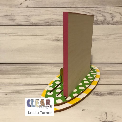 I covered the smaller oval base with green dotted paper, the larger oval base with yellow striped paper, and the frame with red and white striped paper. I adhered an orange cardstock mini scallop frame around the opening of the frame. I added acetate to the back of the frame to keep the photo clean and free of dust (which unfortunately casts weird shadows on the photo, lol). I adhered the frame to the wood backing and let it dry overnight with clips. That’s me on the right, by the way. ;)