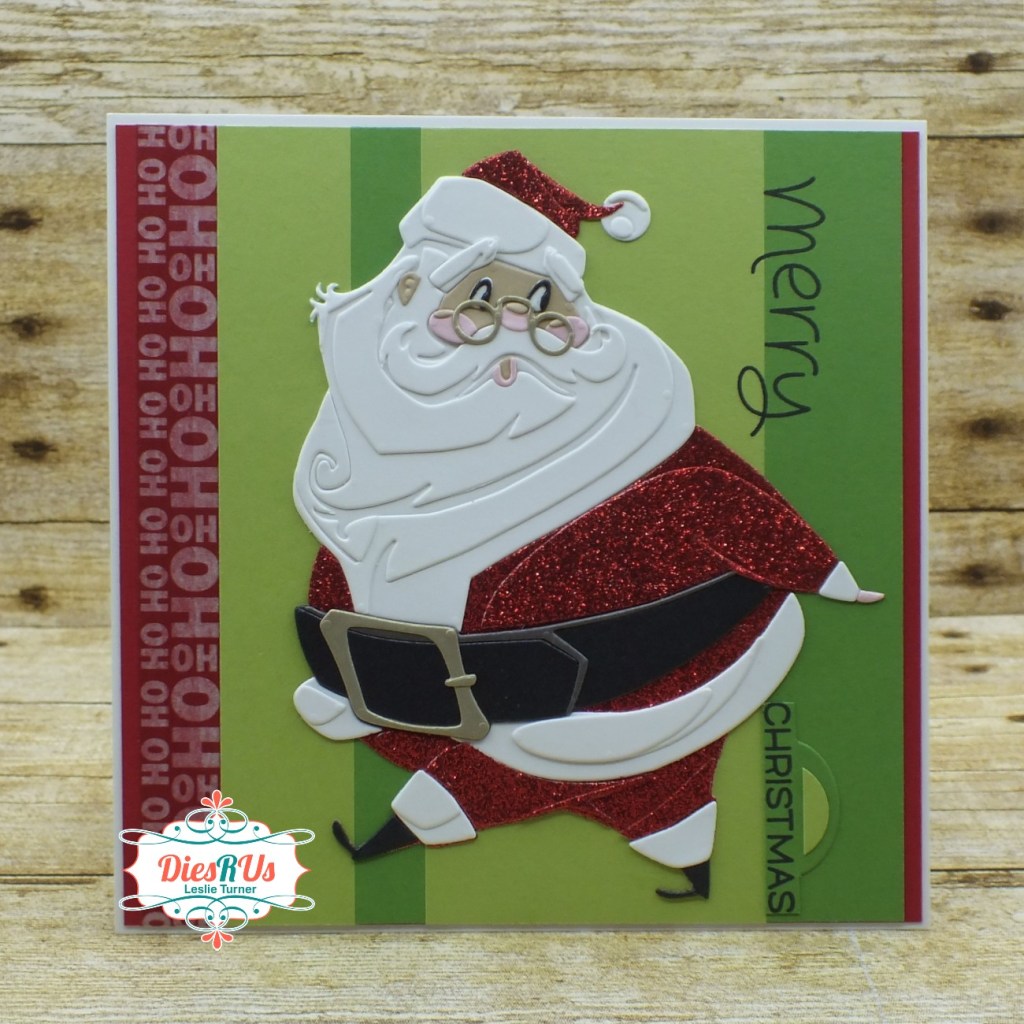 I die cut all the Santa pieces from Neenah Classic Crest 110# Solar White cardstock, CutCardStock Red Flash Silk Glitter 4×6 cardstock, CutCardStock Curious Metallic Night cardstock, CutCardStock Curious Metallic Chestnut cardstock, CutCardStock Curious Metallic Gold Leaf cardstock, CutCardStock Basis Pink cardstock, and CutCardStock Sandcastle cardstock, assembled him and set him aside. I cut a 6″ square top-folding card base from Neenah Classic Crest Solar White 110# cardstock and had to do a little fancy footwork on the back flap because 5-1/2″ square is the largest size card base one can get from a single sheet of 8-1/2″ x 11″ cardstock. ;) I cut a red cardstock background panel, adhered several strips of light and medium green cardstock cut in varying widths along with a strip of washi tape, and adhered the panel to the card base. I adhered Santa and then stamped the sentiment in a vertical fashion on the right side, creating a fun and unique element for the second part of the sentiment to generate a little interest.
