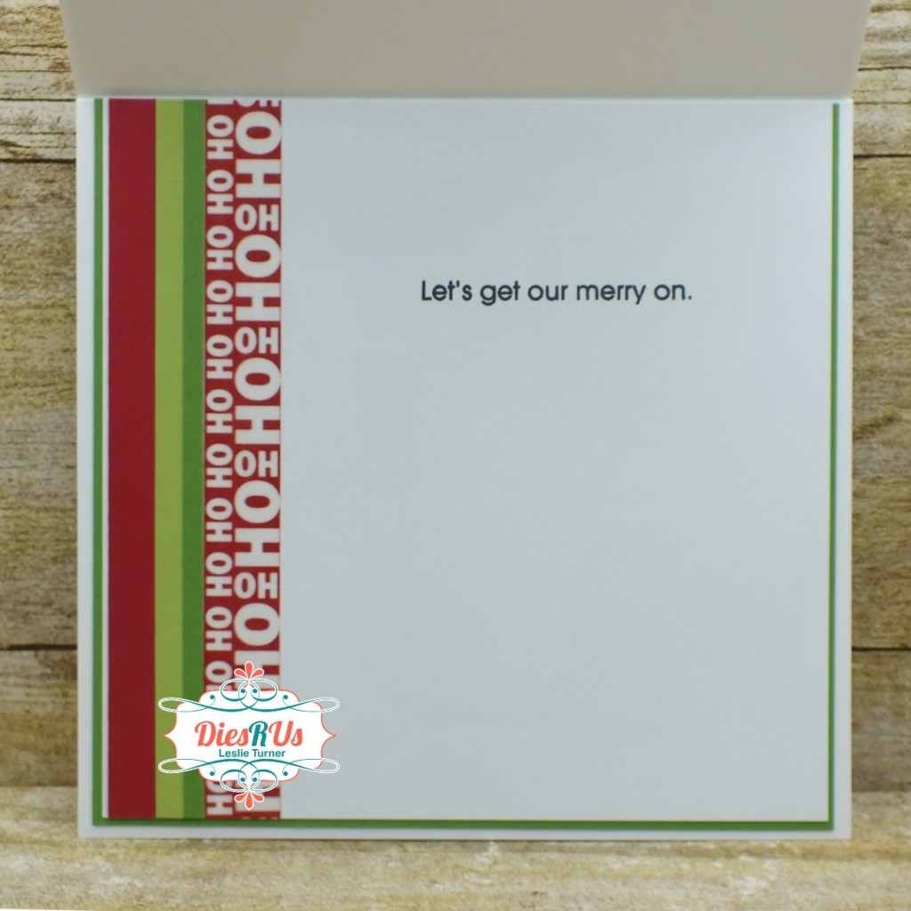 I cut the inside panel from Neenah Classic Crest 80# Solar White cardstock and embellished it with strips cut from the red and green cardstock and a strip of washi tape, stamped the sentiment in black ink and layered the panel on green cardstock.