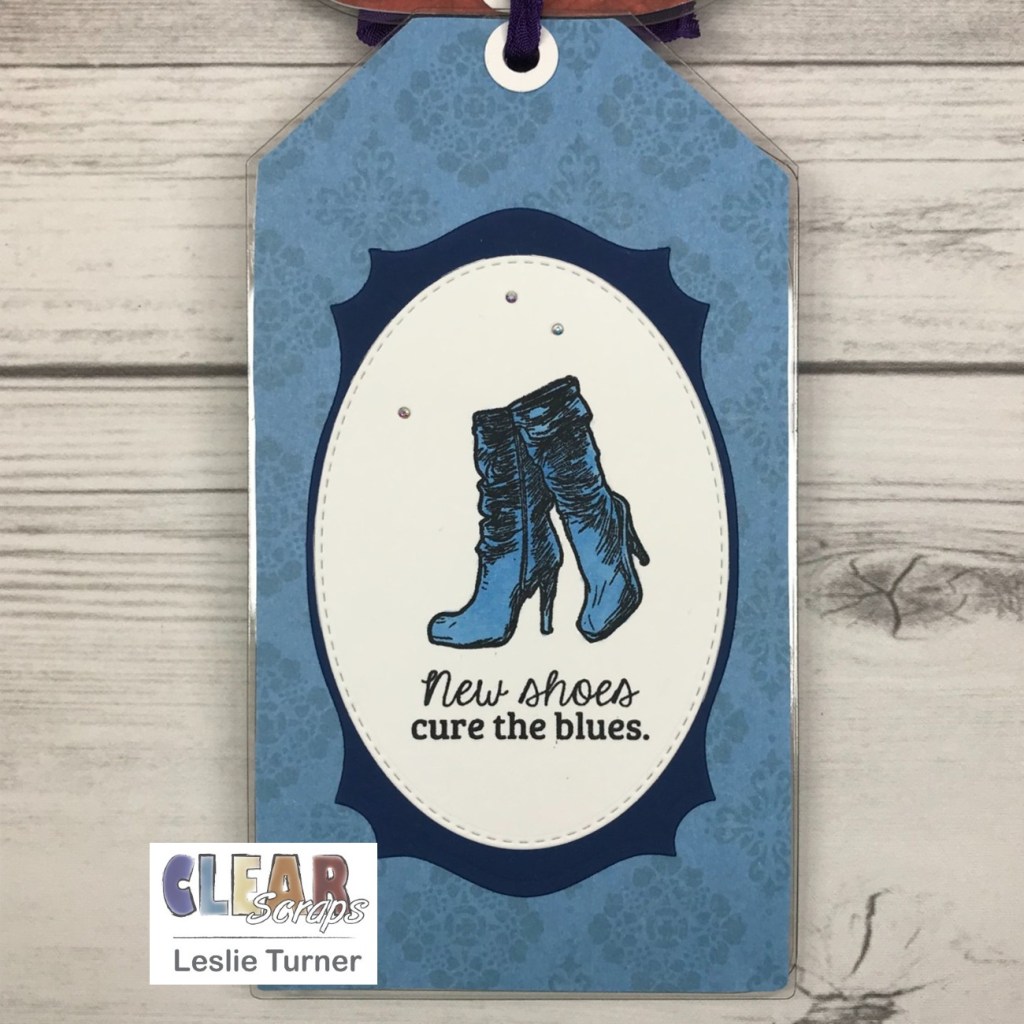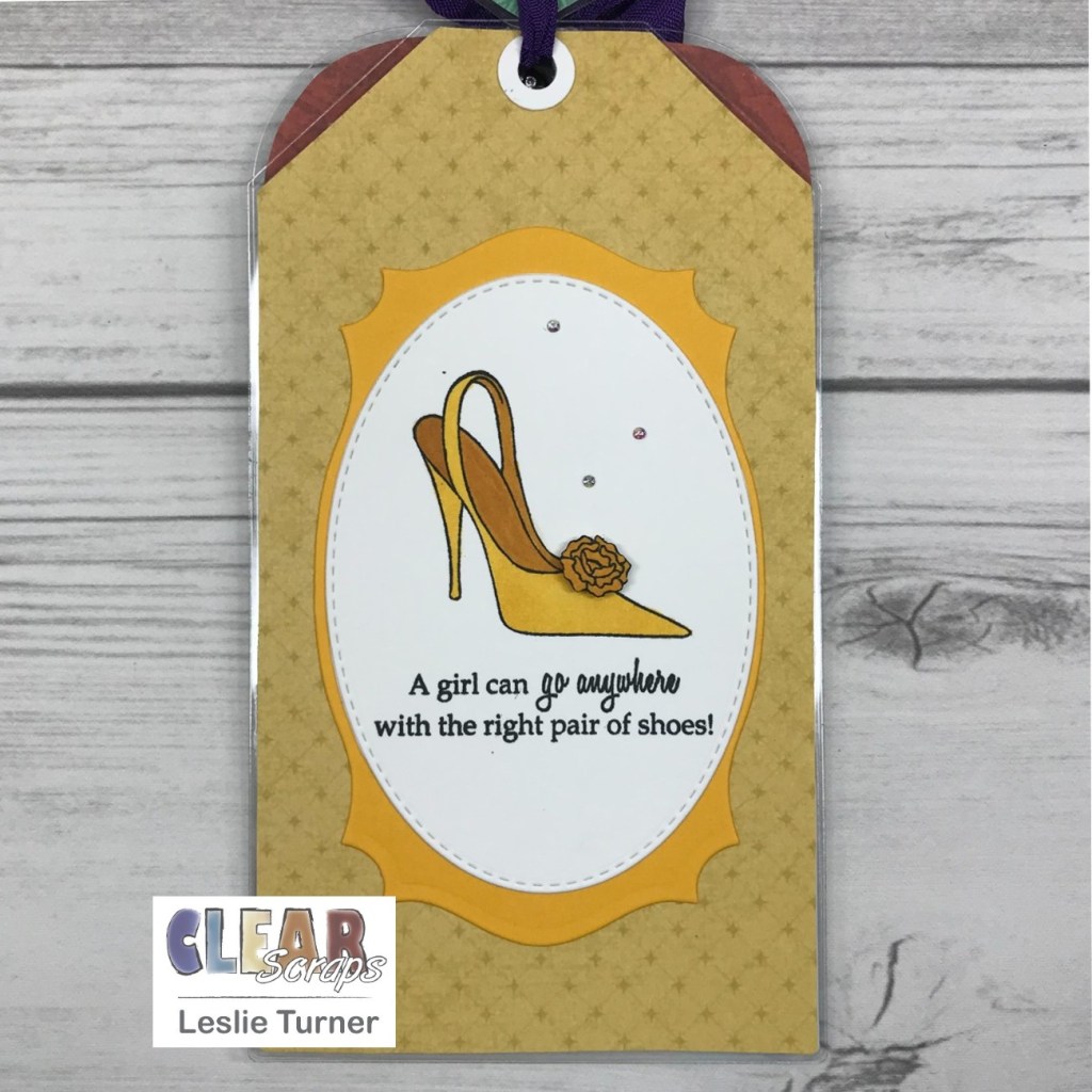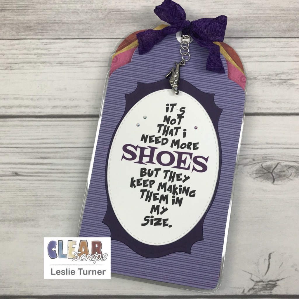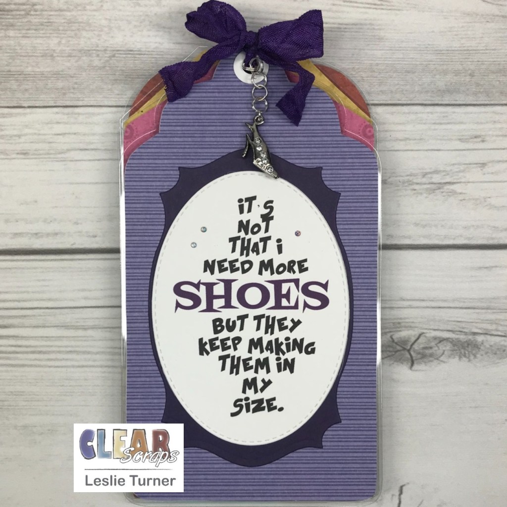 Hey, everybody! Well, another weekend has come and gone, and here we are facing Monday again! But that’s okay as far as I’m concerned… a crafty day is a good day, and it doesn’t matter what day of the week it is! I’m thrilled to be back on the Clear Scraps blog today with another awesome DT inspiration project! Those who know me know that I am passionate about two things: (1) fun folds and (2) shoes! ;) Well, actually three things: (1) cats – we rescue, (2) fun folds and (3) shoes! When I married my kids’ dad many moons ago, I had nearly 60 pairs and he just couldn’t understand it, lol! I don’t have nearly that many now but I still reminisce about the good ol’ days when I had a pair in every color imaginable to coordinate with every outfit. So out came the Acrylic Tag Album to document those memories! This was a fun project!