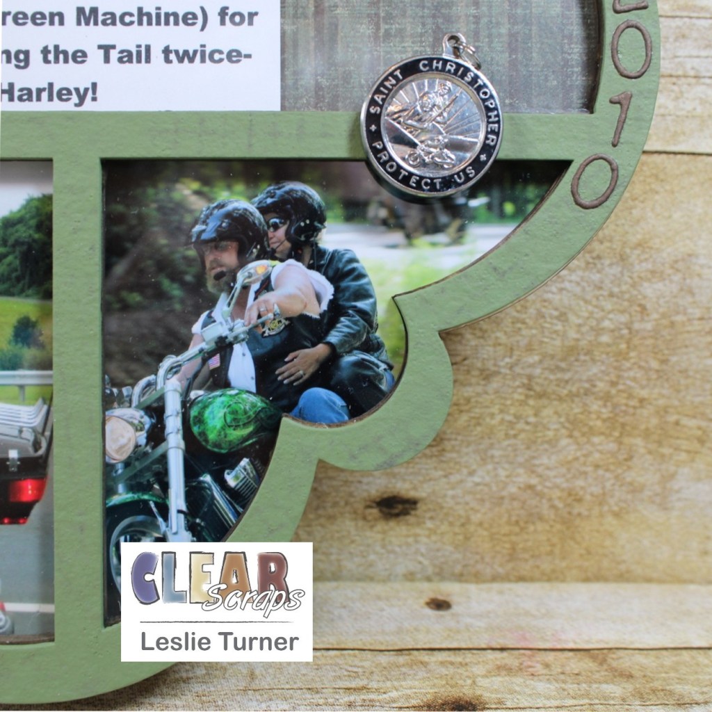Happy Friday, everybody! I hope you’ve had a wonderful week – it sure went by fast! I’m thrilled to be back on the Clear Scraps blog today with another awesome DT inspiration project! I created a project documenting a motorcycle road trip to Deals Gap Motorcycle Resort with a group of friends back in July 2010. Hubby and I rode the Tail of the Dragon twice on two different motorcycles. We rode the Harley on our road trip with our friends and my best friend from high school and college trailered our Honda VTX so we could ride it on the Tail also. What fun we had! I used the Scallop Circle Printer Tray which I painted with green chalk paint, and it is perfect to document our amazing trip!