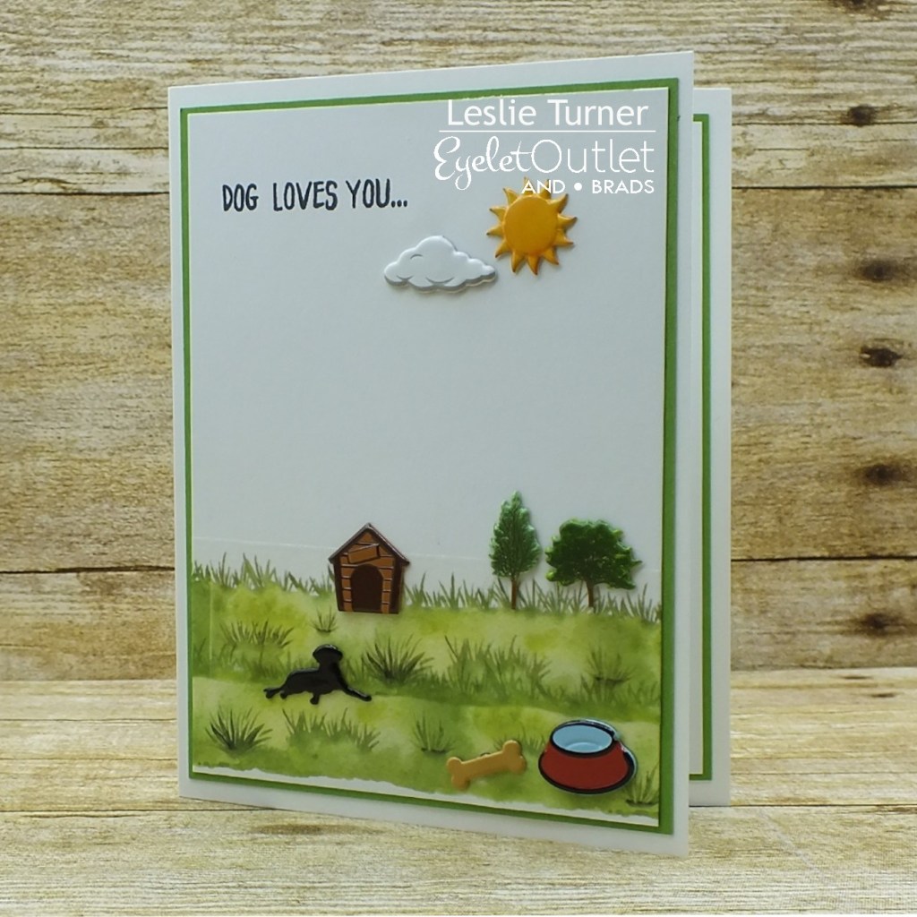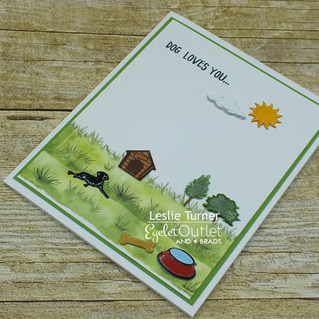 I cut a standard A2 size side-folding card base and layering panel from Neenah Classic Crest 110# Solar White cardstock along with a slightly larger layering panel from CutCardStock Granny Smith cardstock. I applied two strips of Grass Washi Tape to the bottom of the white layering panel and then began building the scene. I affixed a Dog Brad in the center left of the grassy area, and then his house in the background along with his bone and bowl in the foreground, all from the new Kennel Mix Brads. I added two Summer Tree Brads in the background and stamped the sentiment in black ink. I added Sun & Cloud Brads and adhered the panel to the CutCardStock Granny Smith cardstock layer.