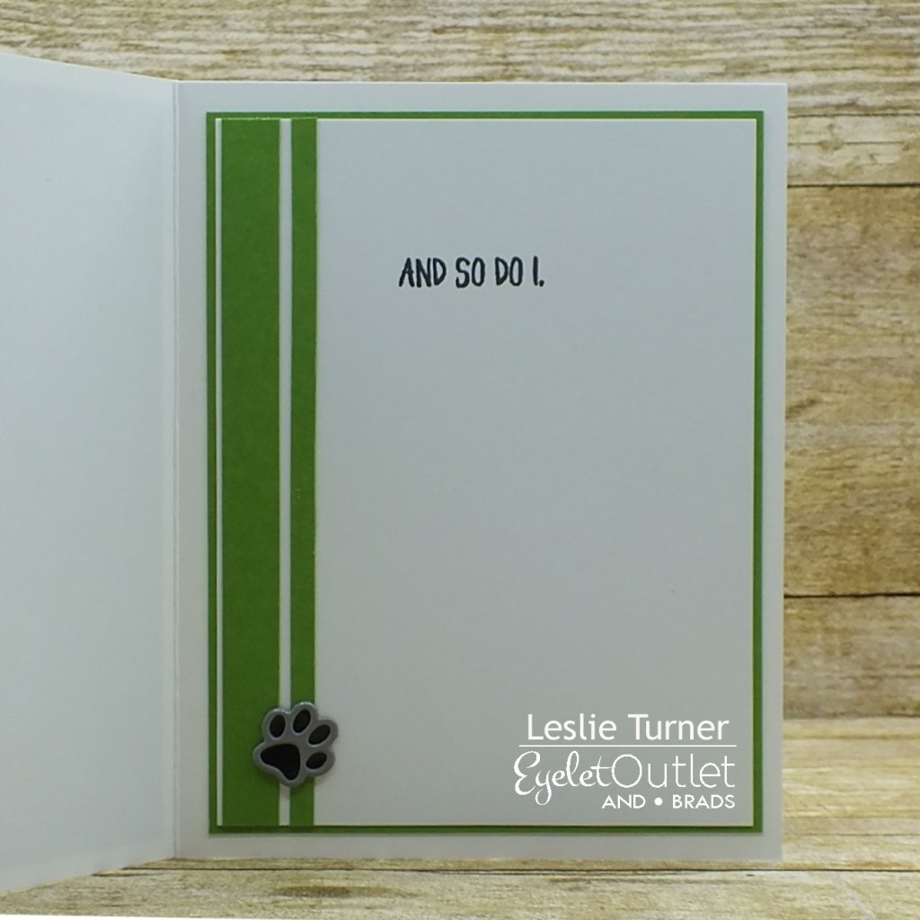 I cut the inside panel from Neenah Classic Crest 80# Solar White cardstock and embellished it with strips of CutCardStock Granny Smith cardstock and a Paw Brad, stamped the sentiment in black ink and layered the panel on green cardstock.
