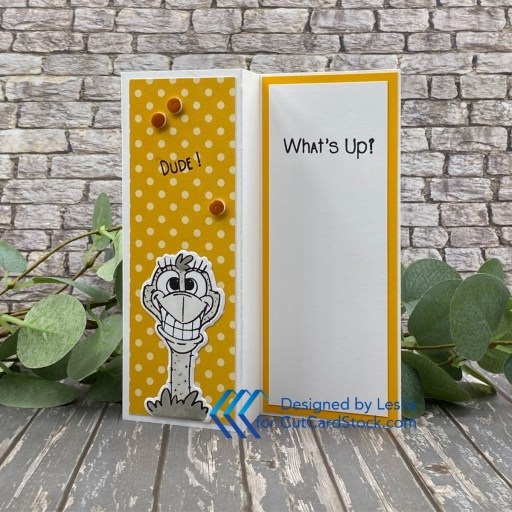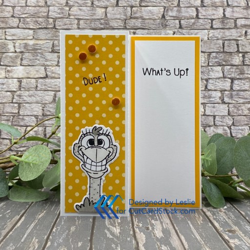 Be sure to see my tutorial on the CutCardStock blog if you want to learn how to make this fun and simple card! I used both 110# and 80# weights of Solar White cardstock along with Lessebo Sunset Orange cardstock. I also used a dotted paper from the Keep It Simple Barnyard Bliss collection as well as the older but wonderful Whimsy Stamps Hey Ostrich stamps and dies. This guy is a hoot, isn’t he?! AND I employed the Scrapbook Adhesives ‘Wear Your Adhesive On The Outside’ technique for the orange foil embellishments! Lots of fun on this card!