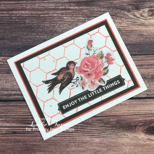 I cut the card base from Cougar Smooth 100# White cardstock along with a layering panel and strips for the shutter design from coordinating papers in the collection. I adhered a chipboard accent from the upgrades to the center of the faux shutter area and added several Keep It Simple Back To Basics Rose Enamel Dots.