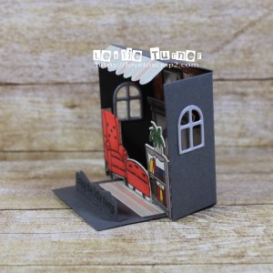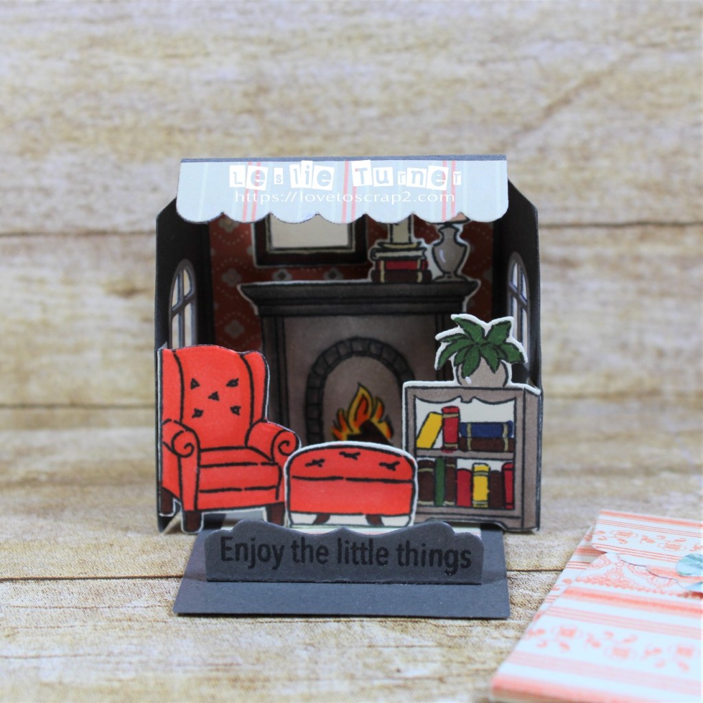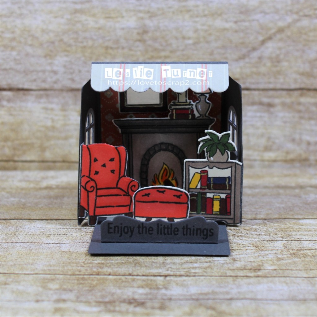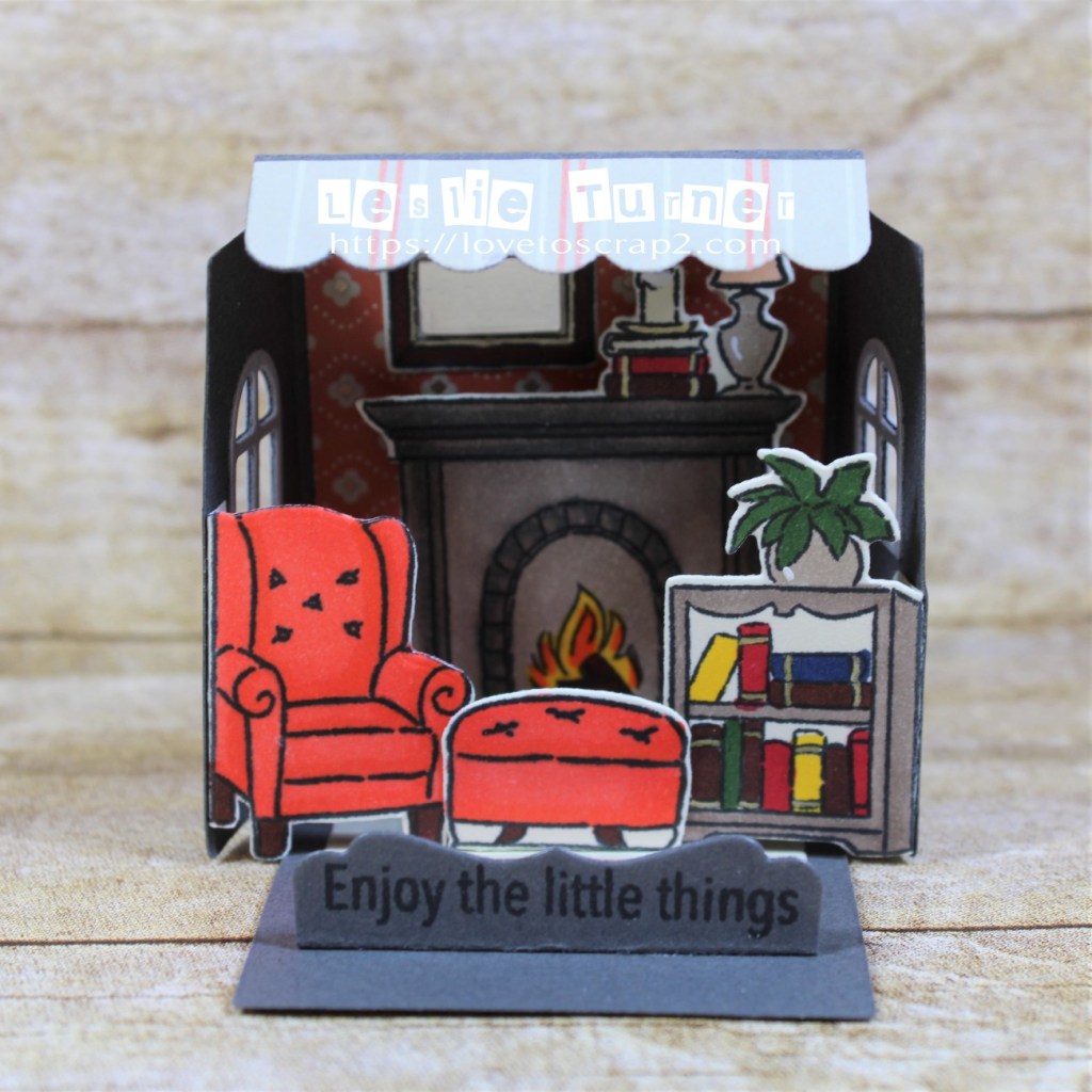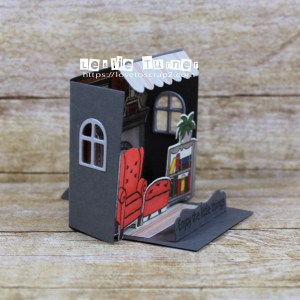 I cut the base from CutCardStock Basis Gray cardstock and used Stardream Metallic Silver cardstock for the window trim on both sides. I used coordinating patterned papers from Polly’s Paper Studio for the wallpaper and rug. I stamped all the elements on Neenah Classic Crest Baronial Ivory cardstock, colored them with alcohol markers and cut them with the coordinating dies. There’s even a mirror on the wall above the fireplace that has a silver foil cardstock ‘mirror.’