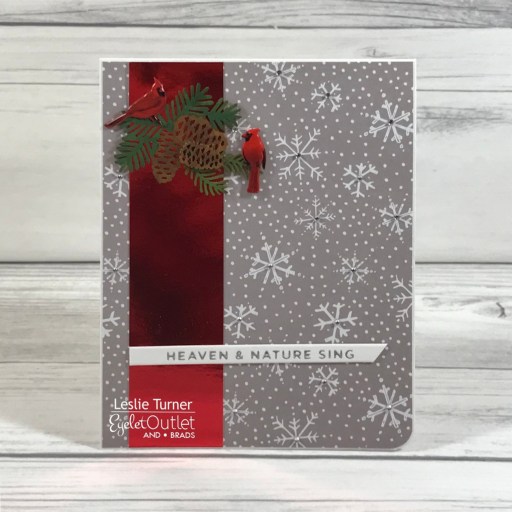And the final card in the line-up is my Heaven & Nature sing card, a Christmas card in traditional red and gray that features our Cardinal Brads and Cardinal Profile Brads along with Clear Jewel Bling.