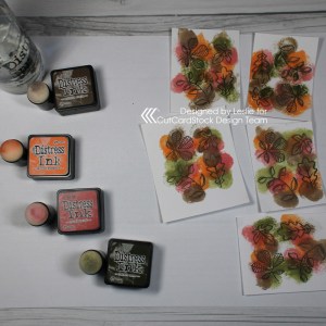 Ink: Memento Espresso Truffle ink; Ranger distress ink- carved pumpkin, fired brick, forest moss, walnut stain