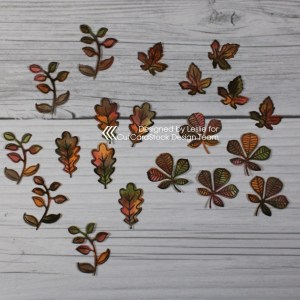 Ink the leaves with carved pumpkin, fired brick, forest moss, walnut stain distress inks. Once dry, remove the washi tape from the back side of the panels and remove the die cuts.