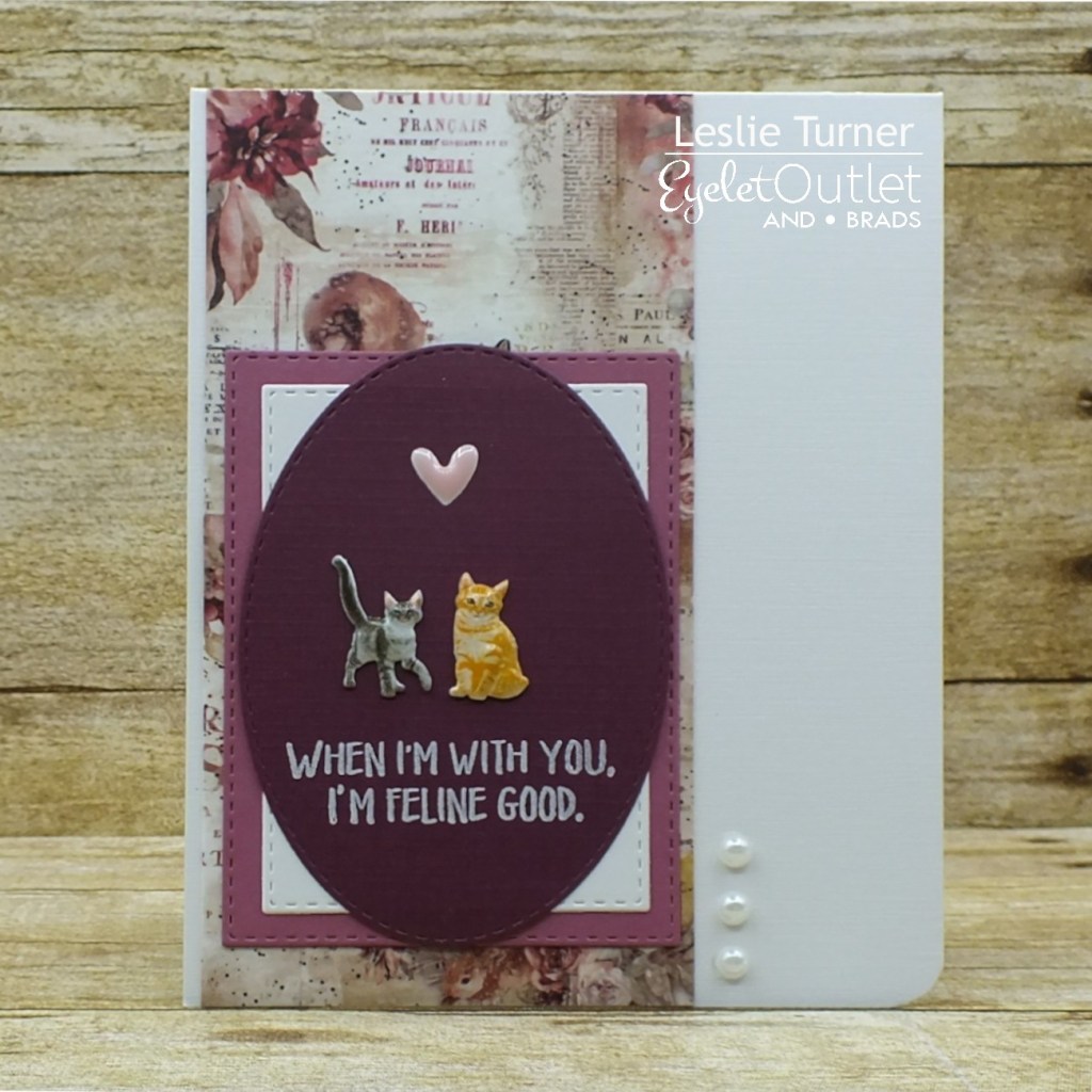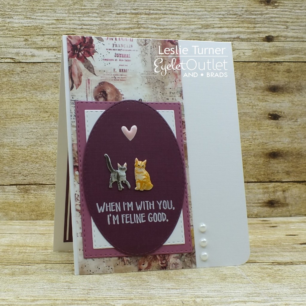 I cut a standard A2 size top folding card base from Neenah Classic Linen 100# Solar White cardstock and rounded the bottom right corner. I covered a strip of Neenah Classic Crest 80# Solar White cardstock with Fox & Flowers Washi Tape and adhered it to the left side of the card base. I cut stitched rectangles from Papertrey Ink Autumn Rose cardstock and Neenah Classic Crest 80# Solar White cardstock along with a stitched oval from CutCardStock Royal Sundance Linen 80# Burgundy cardstock, and layered them together. I stamped the sentiment in white StazOn ink, added two Feline Brads and a Pink Enamel Heart, and adhered the piece to the card front. The finishing touch was adding some White Pearl Bling.