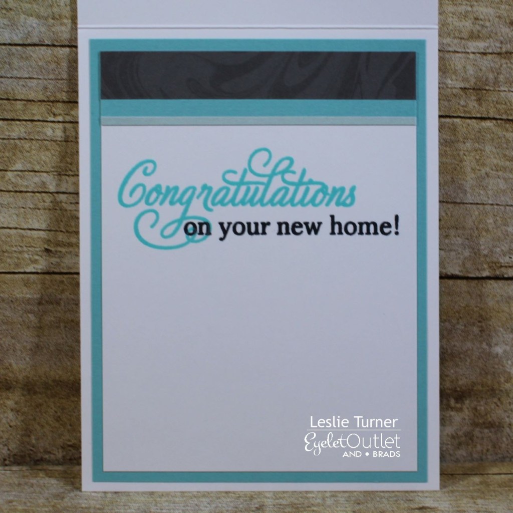 I cut the inside panel from Neenah Classic Crest 80# Solar White cardstock and embellished it with horizontal strips of the gray marble cardstock, CutCardStock Basis 80# Aqua cardstock and CutCardStock Stardream Metallic Aquamarine cardstock, stamped the sentiment in turquoise and black ink, and layered the panel on the Basis Aqua cardstock.