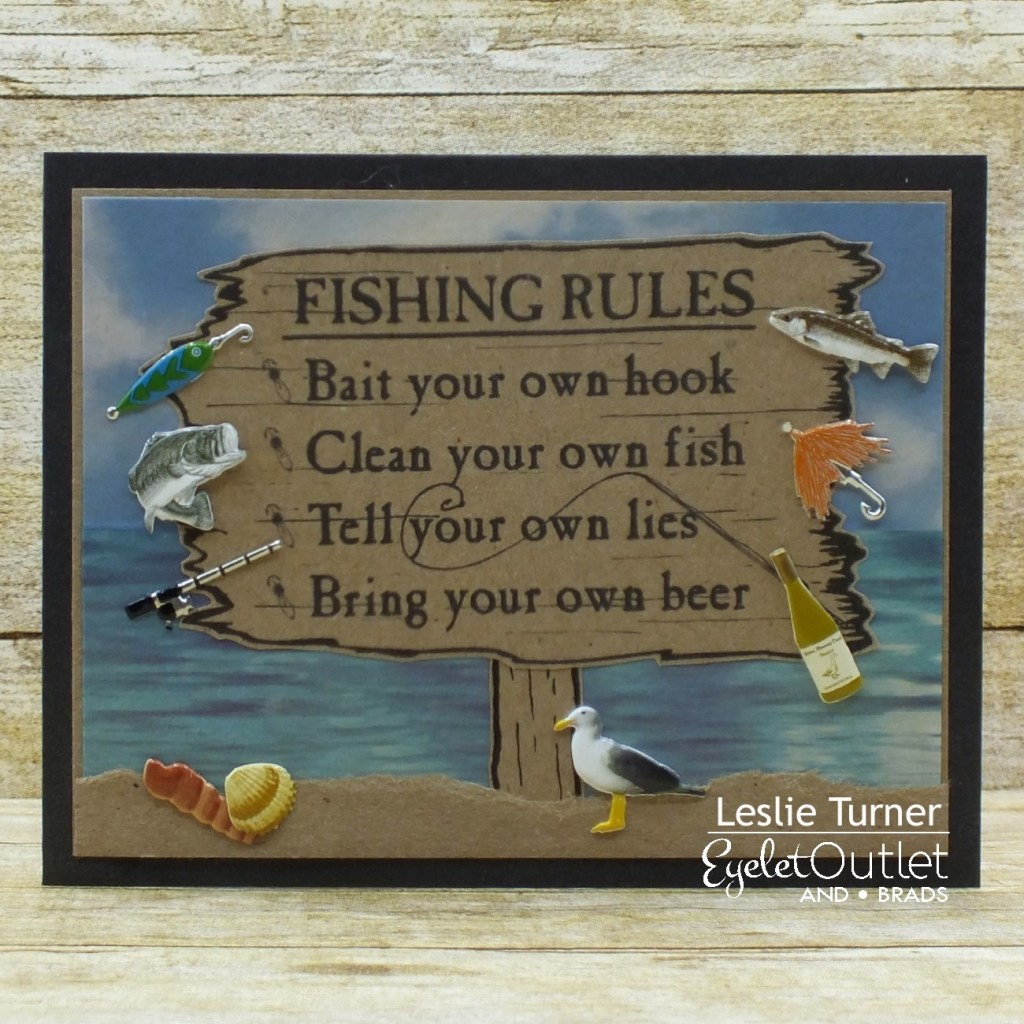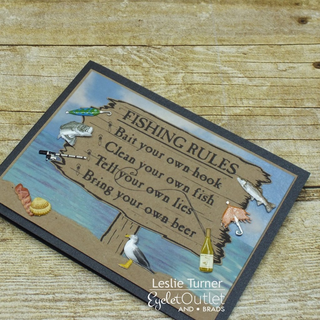 I cut a standard A2 size side-folding card base from CutCardStock Curious Metallic Night cardstock. I cut a background panel from CutCardStock Sandcastle cardstock and covered it with Sky Washi Tape-Wide and Water Washi Tape, then printed the Fishing Rules digital image on CutCardStock Brown Bag Kraft cardstock, fussy cut it and adhered it to the background panel. I hand-drew the sign post with a black Pigma Micron pen, as the post was not included with the digital image. I tore a scrap of brown bag kraft cardstock to create a sand dune, and added Fishing Lure Brads, a Fishing Pole Brad, Trout and Bass Brads, a Wine Brad (don’t laugh – I didn’t have the beer brads yet and the wine bottle looked like it could pass for a beer bottle, lol, but I have linked to the beer brads!), a Seagull Brad and Shell Brads to create my little beach scene.