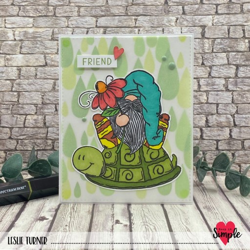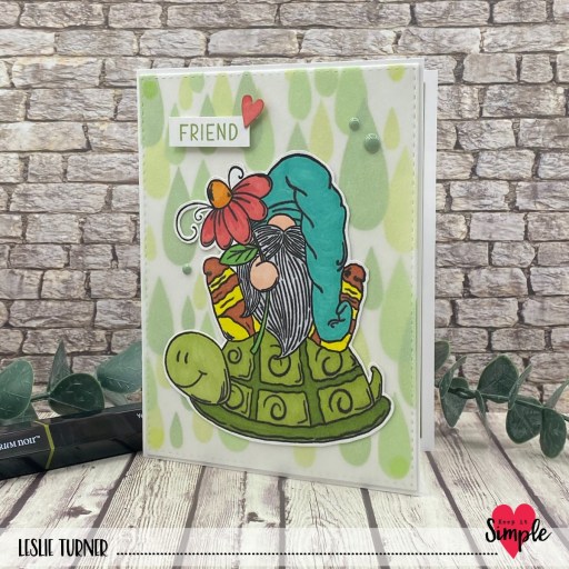Hey everybody, a big ol’ Happy Saturday to you! I’m stoked to share a Keep It Simple DT inspiration project with you today which features our new KIS Art Stencils – Raindrops that I paired with our Bizzy Hands Turtle Gnome stamp set. The stencils are pretty amazing and don’t have to be used for actual raindrops (although they certainly can be). I created a background panel for my ‘phe-Gnome-enol’ Friend card using a few green distress inks. Green is my all-time favorite color and I really enjoyed making this card!