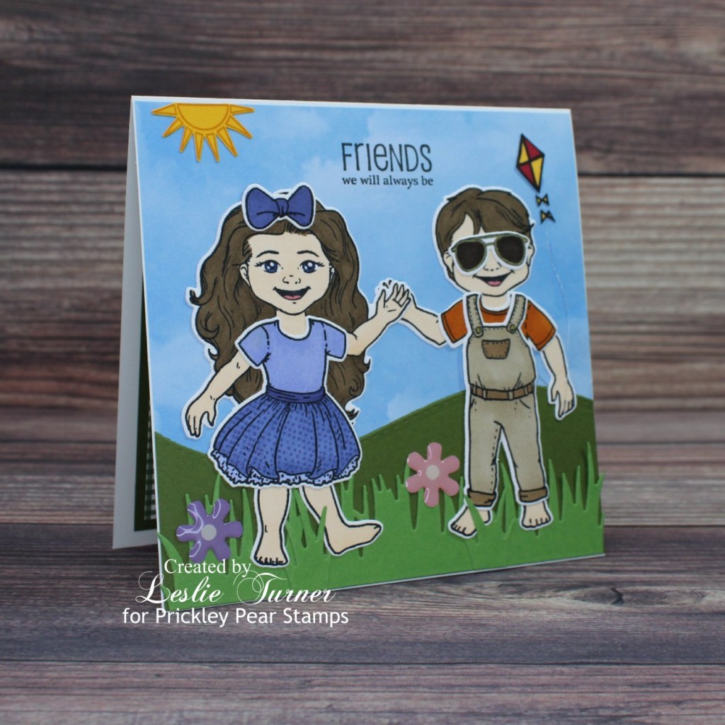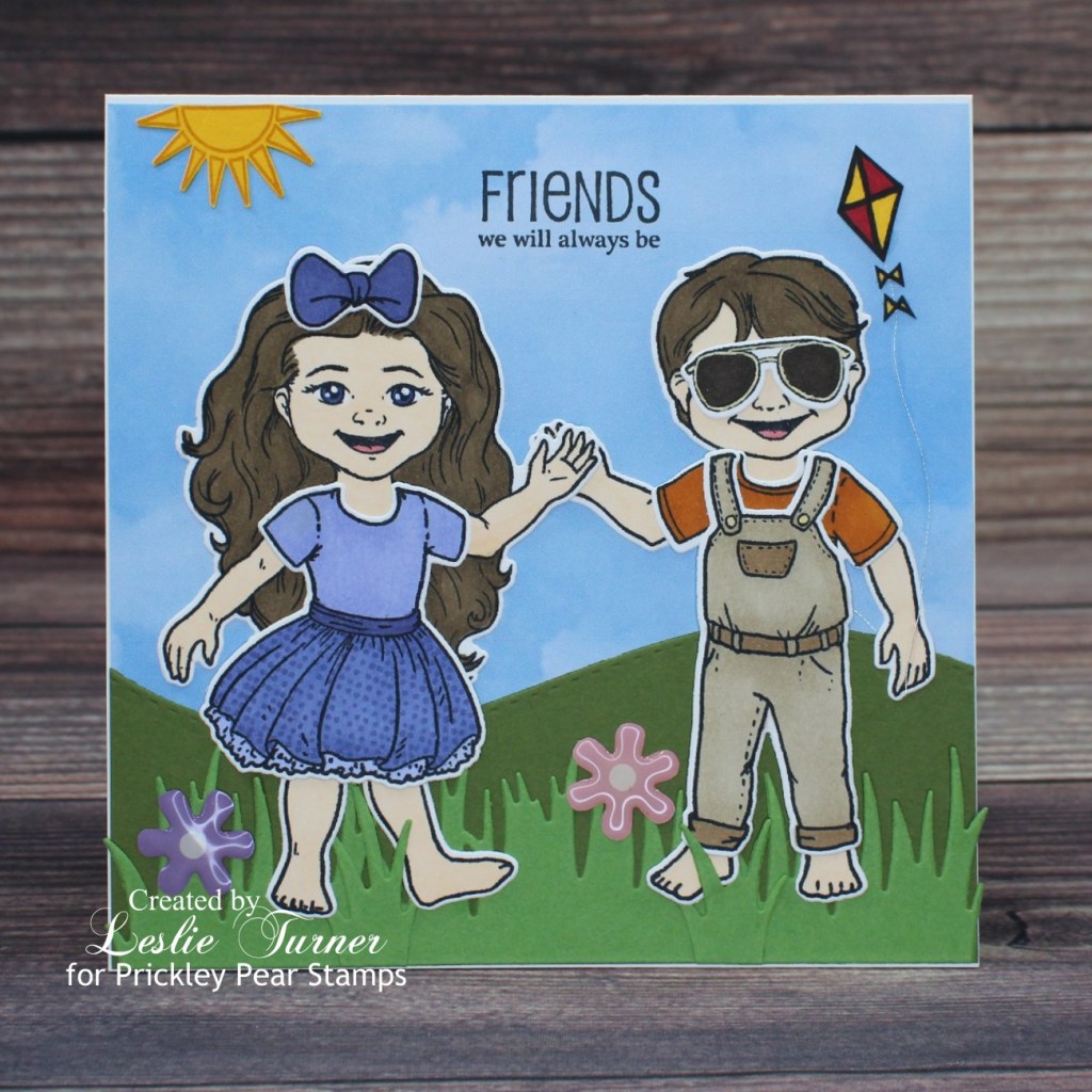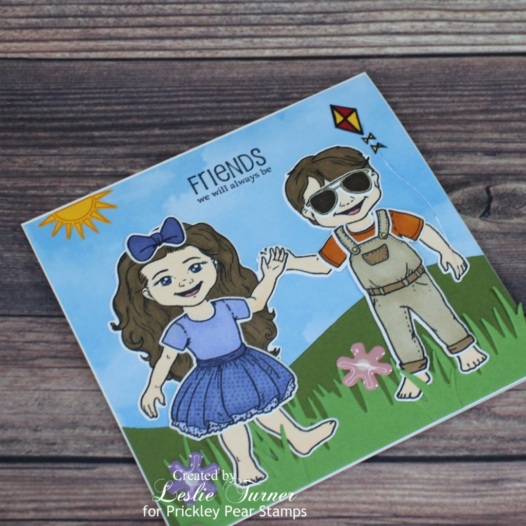 Hi friends! I hope you’re having a beautiful weekend! Our weather couldn’t be any nicer considering we’ve already had our first snowfall several weeks ago! The temps have been glorious over the past several days! Affiliate links are used in this post at no cost to you – I really appreciate your support! I have another sample to share that I created for the new release over at Prickley Pear Stamps! I’ve already mentioned in previous posts that the owners’ son and daughter-in-law have kids named Jack and Lily, and the new Jack and Lily Collection is all about them, but this friendship card depicts them as friends rather than siblings. I used the Hello Lily stamp set and Hello Jack stamp set along with the coordinating Hello Lily die set and Hello Jack die set. Not only are they adorable individually, but they are super cute when paired together! And aren’t they just as cute as can be barefoot in the grass with Jack flying his kite?!