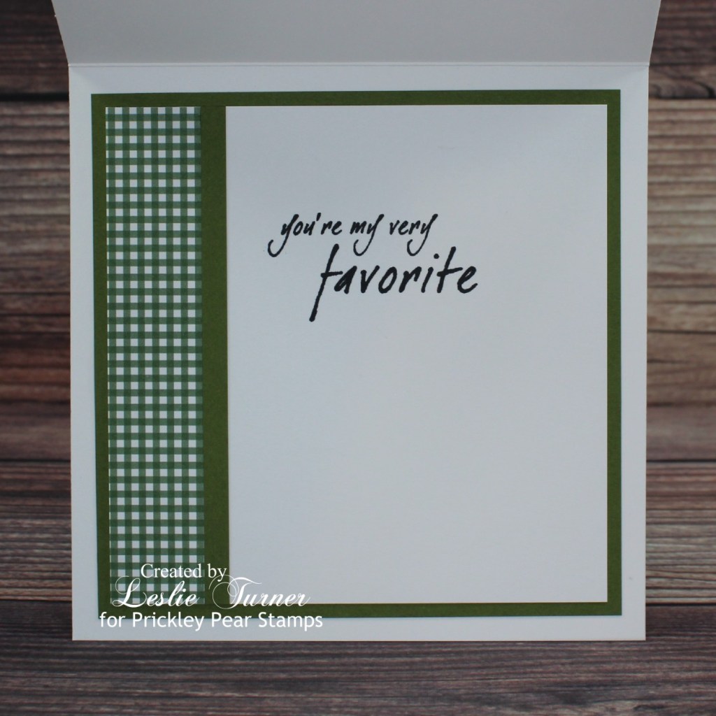 I cut the inside panel from Neenah Classic Crest 80# Solar White cardstock and embellished it with a strip of green gingham patterned paper and narrow strip of CutCardStock Pop-Tone Jellybean Green cardstock. I stamped the sentiment from the Blobby Flowers 2 stamp set in black ink and layered the panel on green cardstock.