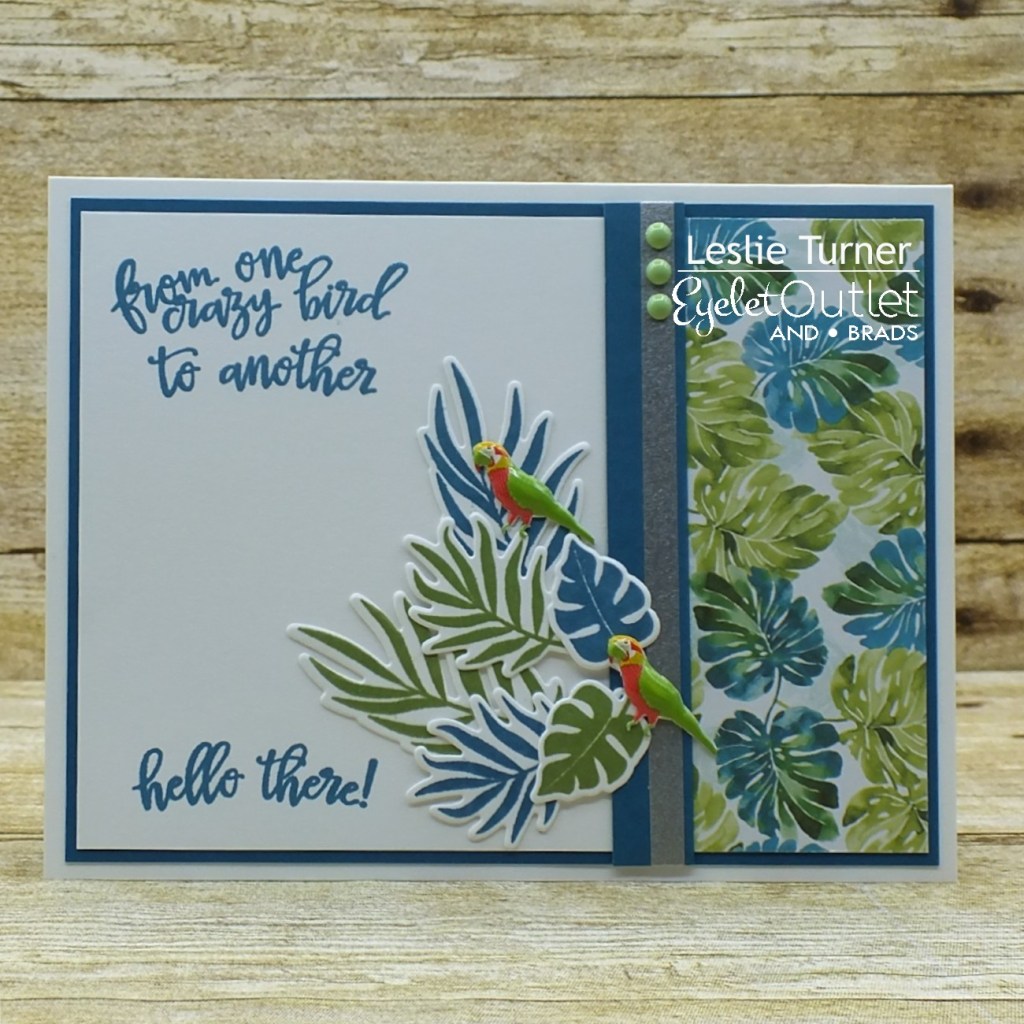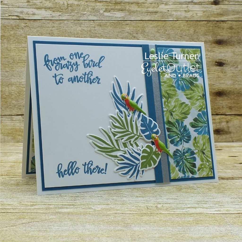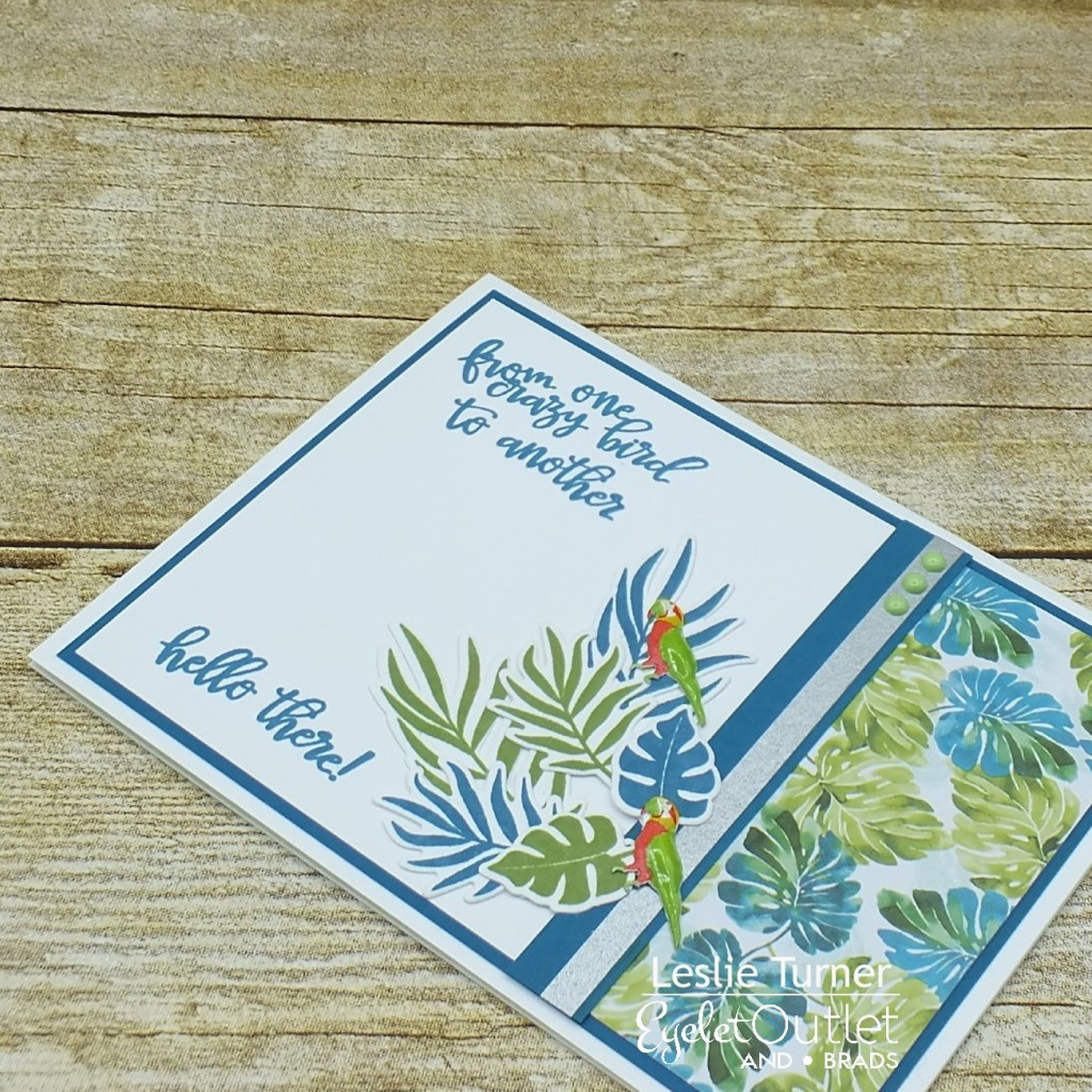 I cut a standard A2 size top-folding landscape card base from Neenah Classic Crest 110# Solar White cardstock. I cut a layering panel from Neenah Classic Crest 80# Solar White cardstock and a slightly larger panel from American Crafts Peacock cardstock which I adhered together. I cut a panel from some tropical leaf paper for the right side and then added a narrow strip of the Peacock cardstock along with a strip of Silver Skinny Washi Tape. I stamped the sentiments in teal ink, then stamped an assortment of tropical leaves on white cardstock scraps in teal and green ink, die cut them and arranged them on the card panel. The final step was adding two Tropical Bird Brads and three Green Enamel Dots, and adhering the panel to the card base.