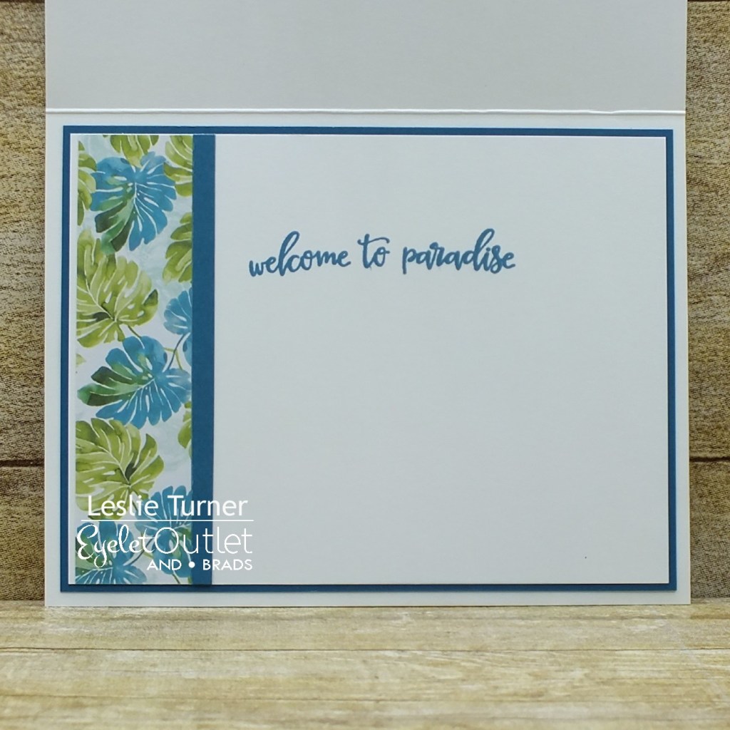 I cut the inside panel from Neenah Classic Crest 80# Solar White cardstock and embellished it with a strip of tropical leaf paper and a narrow strip of Peacock cardstock, stamped the sentiment in teal ink, and layered the panel on the Peacock cardstock.
