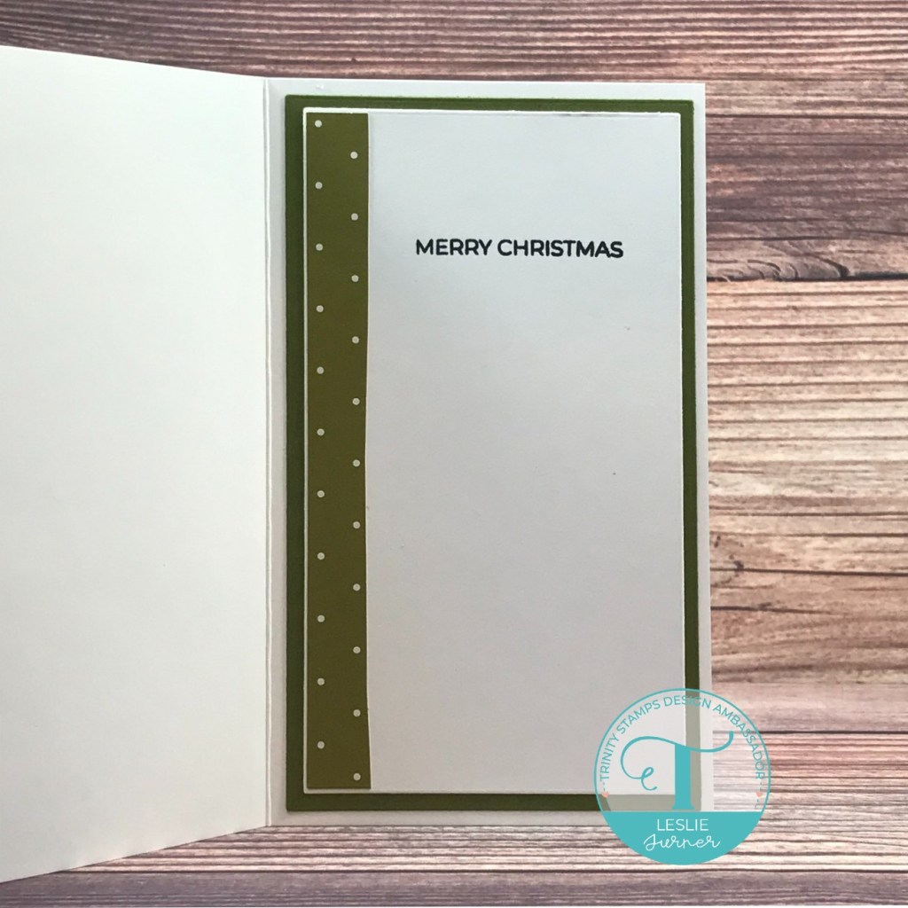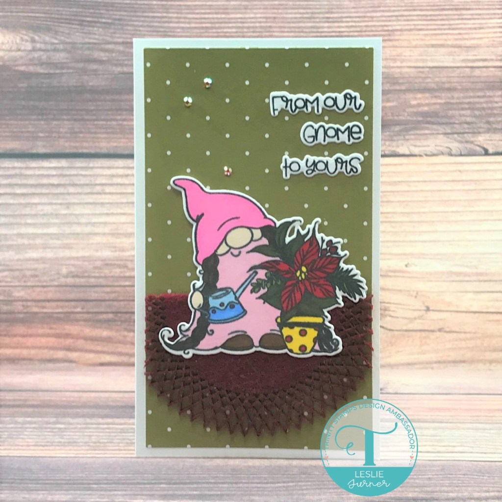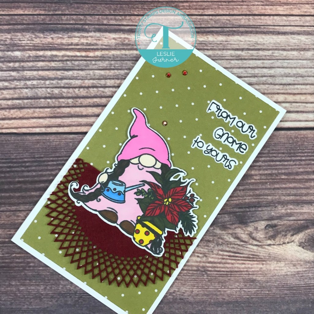 I cut a mini slimline card base and die cut a layering panel and frame using the Mini Slimline Fancy Scalloped Dies and Mini Slimline Tri-Frame Dies. Using the Christmas Gnome Stamp Set, I stamped the gnome, colored him with alcohol markers, and cut him with the coordinating die. I adhered him to the card front, stamped a sentiment from the same stamp set, and added several Eyelet Outlet Green Enamel Dots.