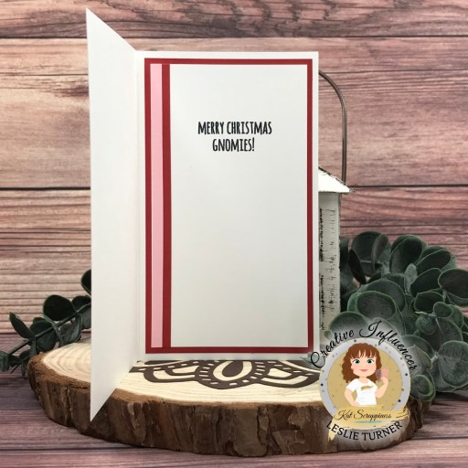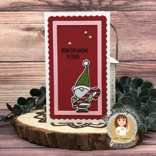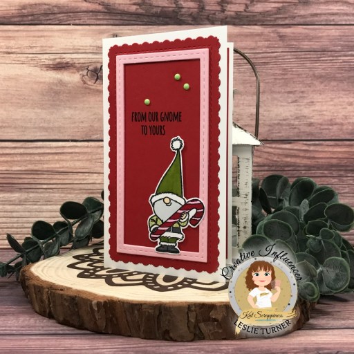 Hey y’all! Well another Monday has rolled around and I hope you had a fabulous weekend! I have another Kat Scrappiness Creative Influencer inspiration project to share with you today, and this one is so stinkin’ cute I can’t stand it! I’ve been playing with the Christmas Gnome Stamp Set and Coordinating Dies again, and along with the Mini Slimline Fancy Scalloped Dies and Mini Slimline Tri-Frame Dies, I created this Christmas card in a red and pink color combo to coordinate with this adorable guy’s candy cane.