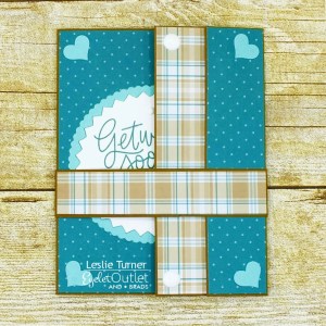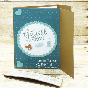 I pulled out a paper pad that hasn’t seen the light of day in quite a while and chose two coordinating prints that complimented the brown cardstock, and cut panels for the front and side flaps. I created a die cut element from CutCardStock Stardream Metallic Lagoon cardstock and Neenah Classic Crest Solar White cardstock on which I stamped the ‘get well’ sentiment, affixed a Kleenex Brad and Mask and Soap Brads, and added several White Enamel Dots. I embellished the corners with hearts punched from CutCardStock Stardream Metallic Lagoon cardstock scrap and slightly larger enamel dots.