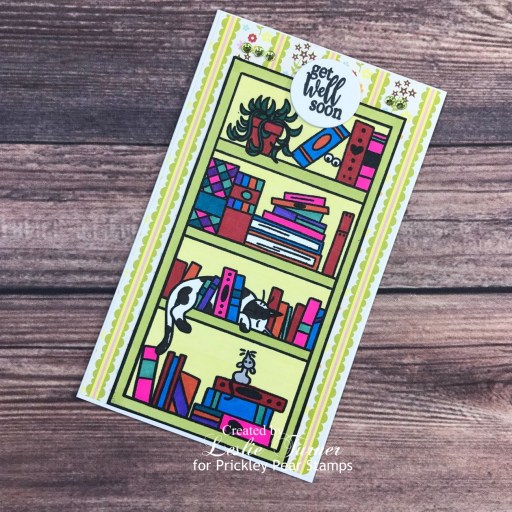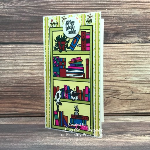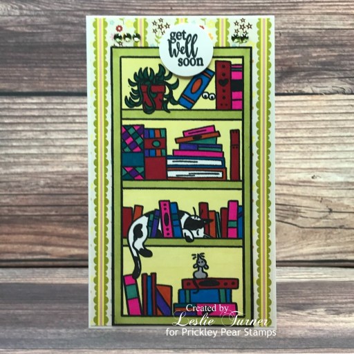 Howdy peeps! Hope you’re having a terrific Tuesday and not working too hard! I’ve been to the vet this morning to drop off our latest rescue for spaying. She’s the sweetheart who was sick when the neighbor brought her to us several weeks ago and had the six babies that didn’t survive. She’s getting along great with our other indoor cats and has quickly become one of the indoor kitty clan. ;) Okay, now for today’s share – a super cute get well card created with the new Nap Time stamp set in the latest Prickley Pear Stamps release. My goal was to make the bookshelf look like it was up against a wallpapered wall, and I think I made that happen! This is such a fun stamp set (and a large one) that’s fun to color!