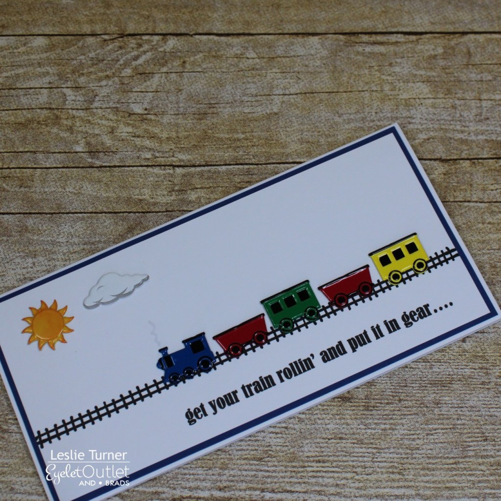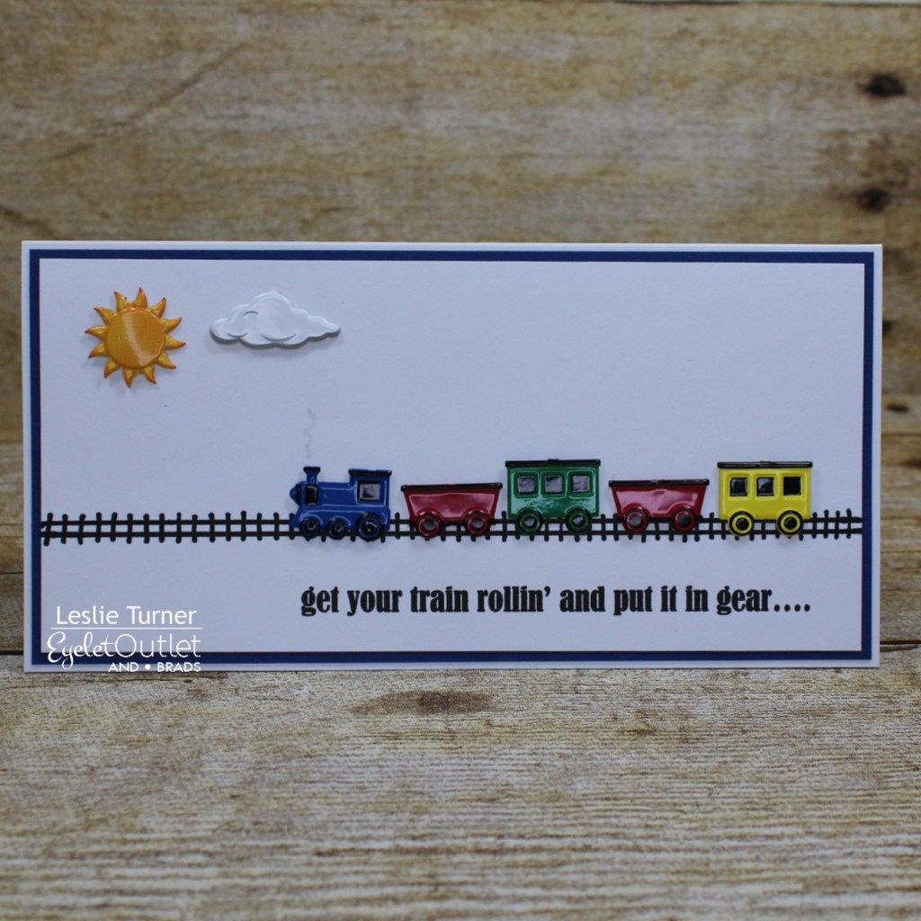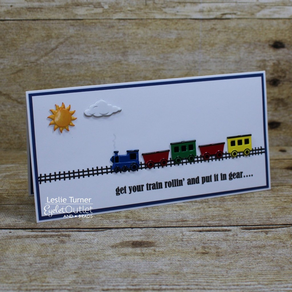 Hi everyone! A very Happy Saturday to you – I hope you’ve had a great week! October is probably my favorite month of the entire year and I can’t believe it’s here already! Yay for my birthday and Yay for Fall! ;) Affiliate links are used in this post at no cost to you. I really appreciate your support! I’m stoked to be back on the Eyelet Outlet blog today with another awesome DT inspiration project! I created a mini slimline for a super sweet little boy who turned one a few days ago! This was such a fun card and features our Train Mix Brads and Sun & Cloud Brads. I semi-CASEd the sentiment on one of my own designs from several years ago where I used a tractor.