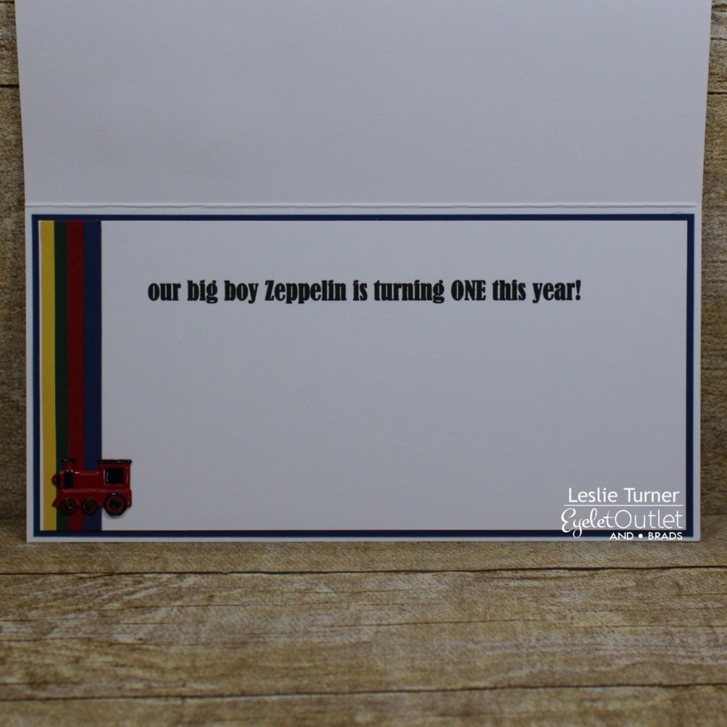 As mentioned above, I printed the front and inside sentiments on Neenah Classic Crest 80# Solar White cardstock and trimmed the panels down slightly smaller than the blue layering panels. I embellished the white sentiment panel with strips cut from CutCardStock Basis Green cardstock, CutCardStock Pop-Tone Wild Cherry cardstock and CutCardStock Pop-Tone Lemon Drop cardstock, added an additional Train Mix Brad, and layered the panel on CutCardStock Basis Blue cardstock.