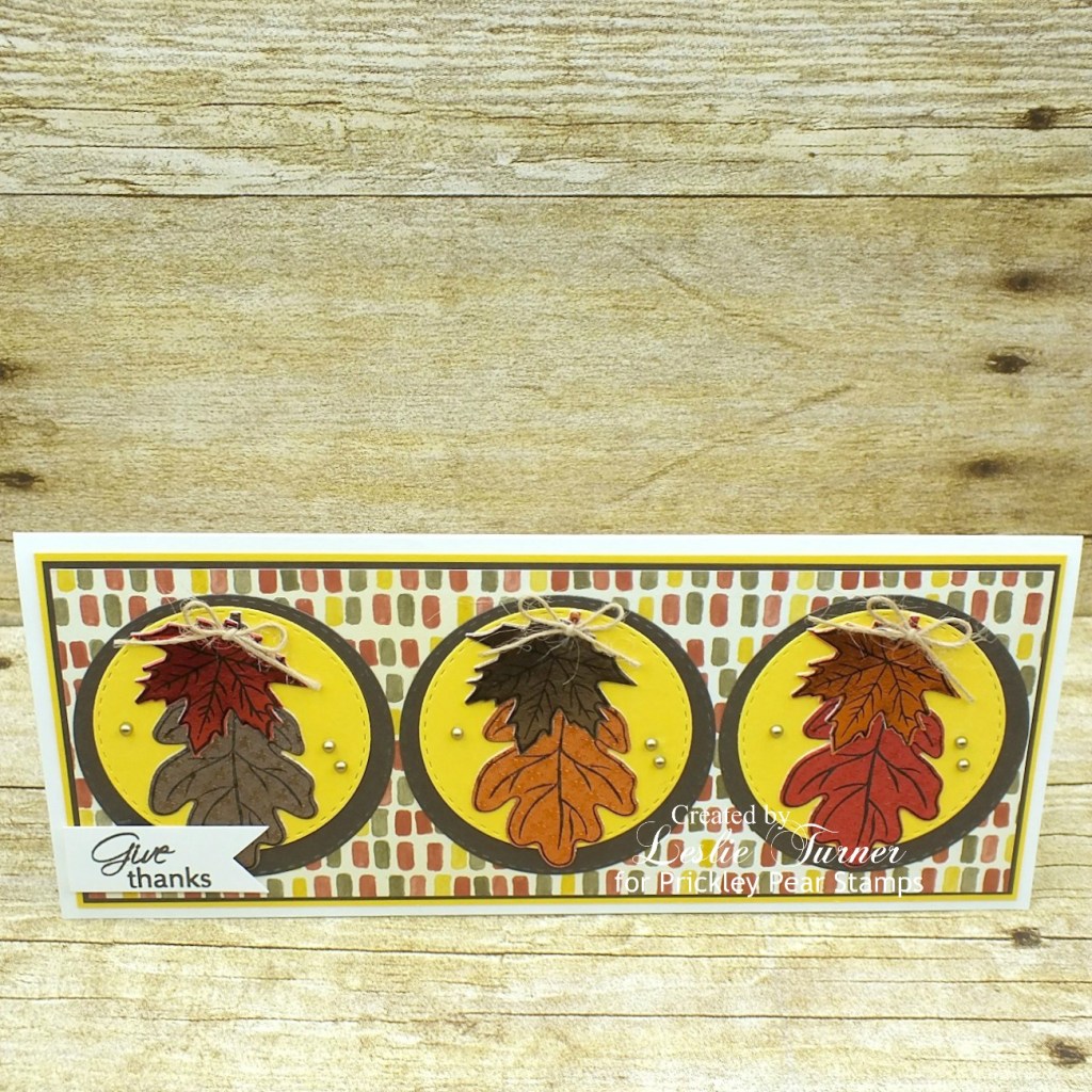 Hi friends! Happy Monday – I hope you had a great weekend! They sure do go by fast! Affiliate links are used in this post at no cost to you. I really appreciate your support! Our new challenge is live this morning over at Love To Craft Challenge Blog and I’m thrilled to share my DT inspiration project for LTCCB #64 – November Anything Goes! Fall is in full swing so here’s a pretty slimline chock full of Fall colors using Prickley Pear Stamps Oak & Maple Leaf stamp set and coordinating Prickley Pear Stamps Oak & Maple Leaf die set! OMGosh, they are gorgeous! Prickley Pear Stamps also carries Rinea Foiled Paper Autumn Variety Pack that I used for these leaves.