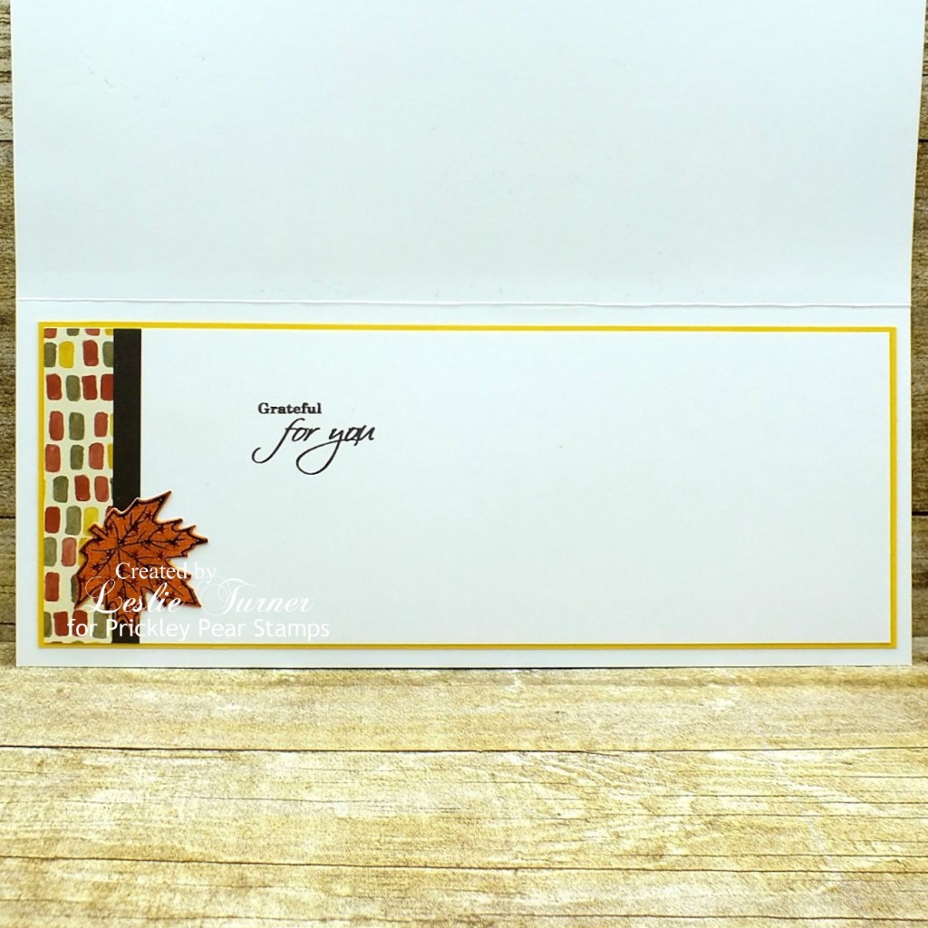 I cut a panel for the inside from Neenah Classic Crest 80# Solar White cardstock and embellished it with leftover strips of patterned paper and the textured brown cardstock used on the front, stamped the sentiment in brown ink, and layered the panel on CutCardStock Camomile cardstock. I had a leftover die cut foiled maple leaf which I adhered to the bottom left corner of the panel.