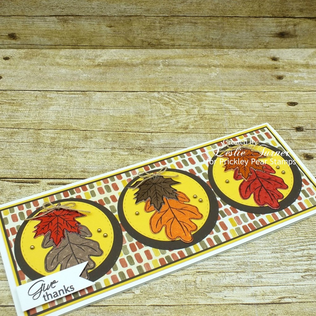 I cut a top-folding slimline card base measuring 9″ x 3-3/4″ from Neenah Classic Crest 110# Solar White cardstock. This is my go-to size because it fits perfectly in a #10 business size envelope which the slimline was designed to fit in, and still allows for some dimension. I cut layers from Stampin’ Up patterned paper, Darice textured brown cardstock and CutCardStock Camomile cardstock for the front, layered them together and adhered the panel to the front of the card base. I die cut three stitched circles from CutCardStock Camomile cardstock and three slightly larger stitched circles from the textured brown cardstock, layered them together in three sets, offsetting the yellow circles toward the top, and adhered them to the front panel. I adhered small foiled paper squares to white cardstock and die cut a variety of oak and maple leaves in different colors using the Prickley Pear Stamps Oak & Maple Leaf die set, and layered two on each set of circles. I added twine bows and flat-back pearls to each set of circles. I stamped a sentiment in brown ink on white cardstock, trimmed it and flagged one end, and adhered it to the front with foam pads.