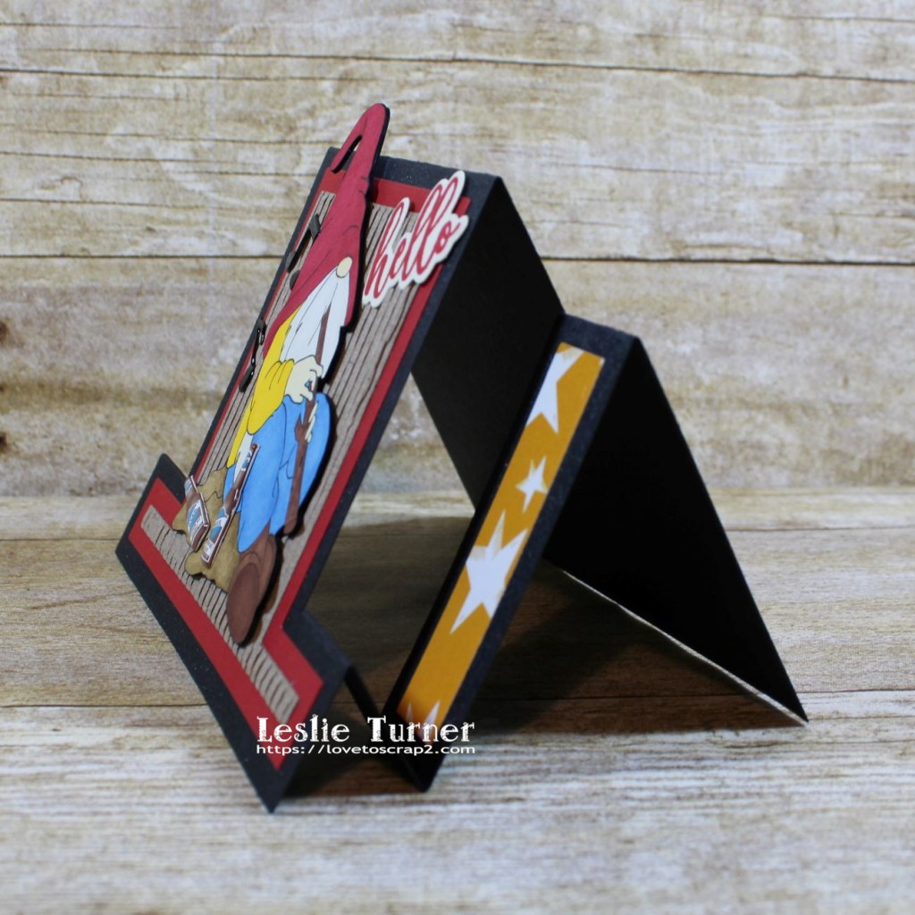 I’ve made a number of easel cards over the years and have always used a paper trimmer that has the ability to make independent cuts without totally cutting the cardstock or paper in two, if that makes sense. Well, I’ve recently found several die sets that do all the work – and used one of them for this card. No measuring – just die cutting… and what a dream! ;) I die cut the base from CutCardStock Curious Metallic 111# Night cardstock, and front layers from CutCardStock Basis 80# Red cardstock, Canvas Corp Corrugated Kraft, and Canvas Corp Trendy Halloween Paper Collection (the yellow star paper). I printed the digital image four times, colored one of them with alcohol markers and layered them for a little dimension, and adhered him to the card base. I added the beer brads and music note brads, then adhered the sentiment stamped from Waffle Flower Essential Sentiments stamp set in Catherine Pooler Rockin’ Red ink which I cut with the coordinating Waffle Flower Essential Sentiments die.