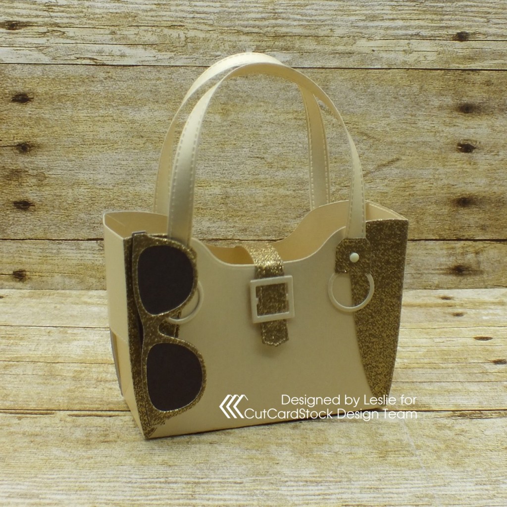 Hi everyone! I hope you’re having an awesome week! I’m stoked to be back on the CutCardStock blog today with an awesome DT inspiration project featuring some gorgeous Glitter cardstock which happens to be on sale this month so be sure to get some! Affiliate links are used in this post at no cost to you. I really appreciate your support! I created a pretty weekender handbag (for my ongoing Paper Purse series) using CCS Gold Glitter cardstock that I paired with Neenah Classic Linen Gold Pearl cardstock – which will hold a gift card, cash, chocolates or maybe some jewelry! And dig this… this handbag has a matching set of sunglasses, also made from CCS Gold Glitter cardstock, that I paired with Pop-Tone Hot Fudge cardstock! I’m so smitten with this ‘glitterlicious’ set I can hardly stand it!
