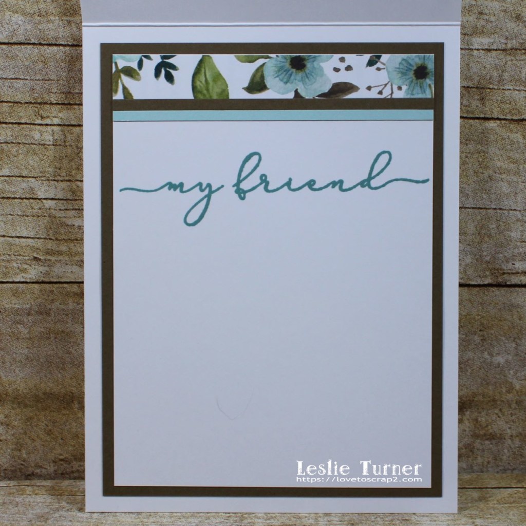 I cut the inside panel from Neenah Classic Crest 80# Solar White cardstock and embellished it with strips of the DSP and cardstock used on the front, stamped the Waffle Flower sentiment (from the Sentiment Additions stamp set) in Catherine Pooler Skylight ink (did I mention how much I love her ink line?!), and layered the panel on Soft Suede cardstock.