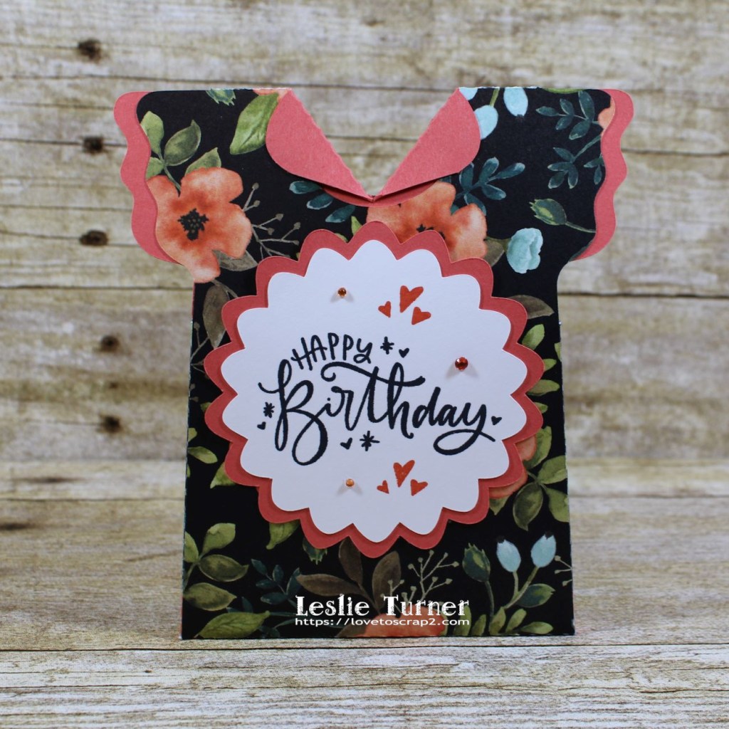 I cut the pieces for the dress from Stampin’ Up Calypso Coral cardstock and Stampin’ Up Whole Lot of Lovely DSP, and the sentiment panels from Stampin’ Up Calypso Coral cardstock and Neenah Classic Crest 80# Solar White cardstock, then assembled it. I stamped the Brutus Monroe sentiment and little hearts in Memento Tuxedo Black ink and Catherine Pooler Mandarin Spice ink, and then added some orange gemstones. I added some tiny magnets for closure to complete the project.