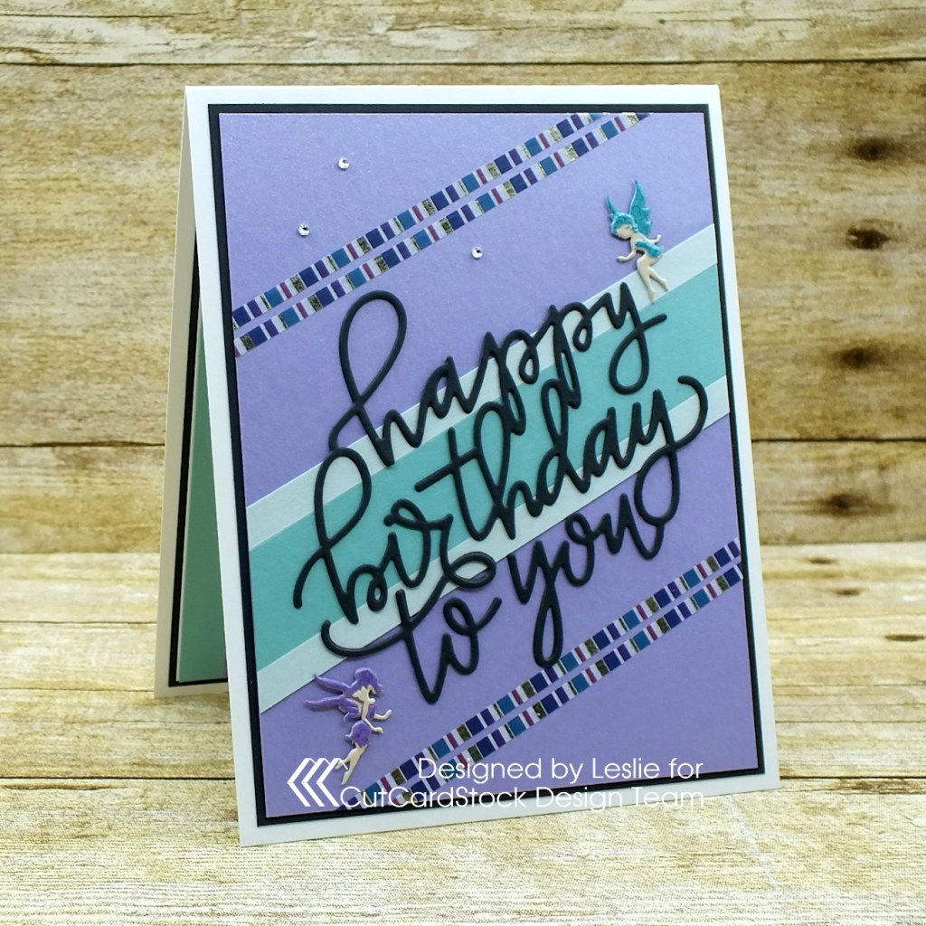 I used the My Favorite Things Stitched Pinking Edge Square STAX to cut panels from a pretty butterfly print in the Kraft & Creativity Showering Nature 12×12 paper pack. I fussy cut a butterfly and adhered it to a Basis White cardstock scrap for stability, and adhered it to the base for an easel stop. I added the sentiment die cut from Gold Leaf cardstock using the My Favorite Things Swirly Birthday die. The finishing touch was adding several YNS Purple Glitter Gumdrops.